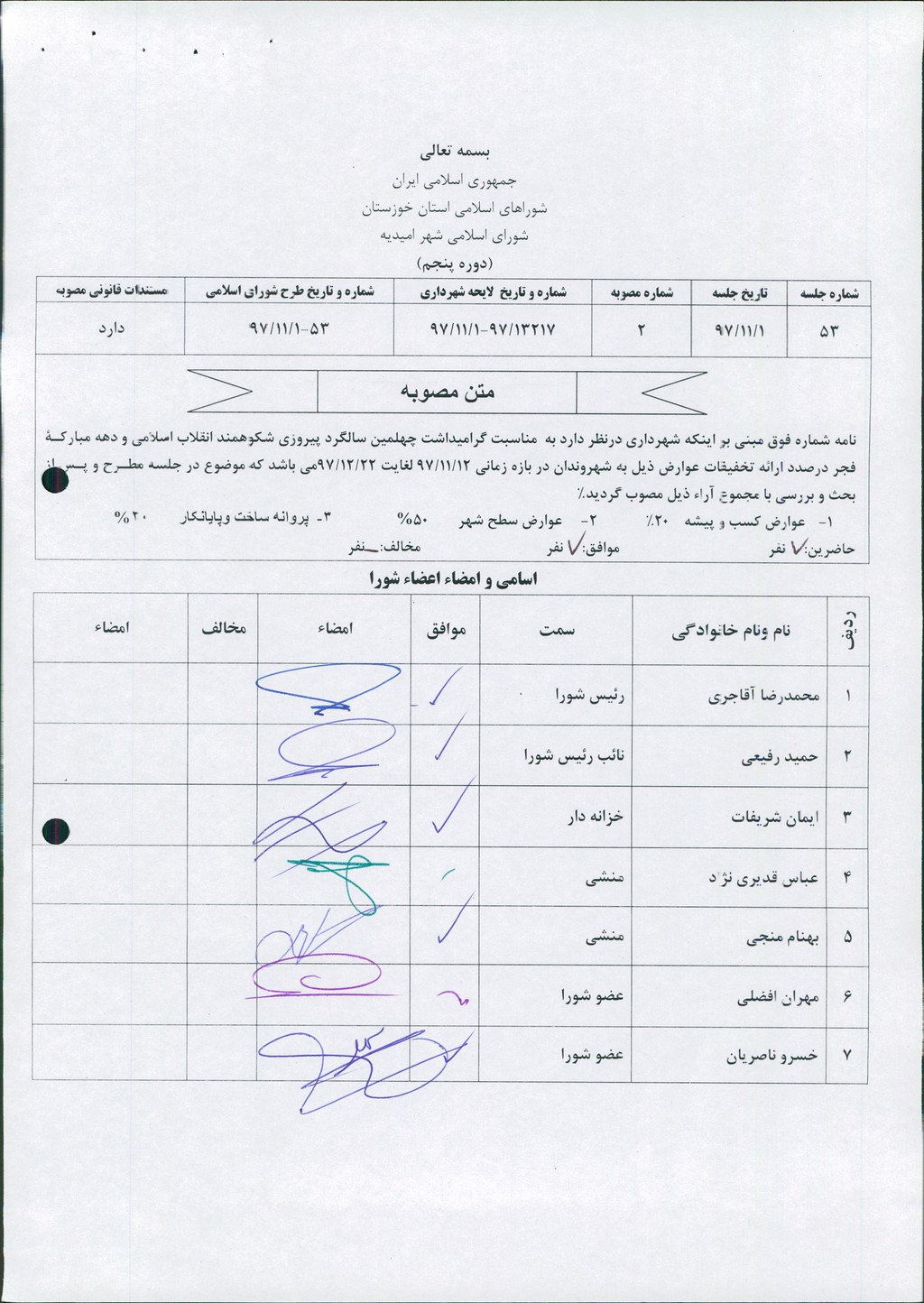مصوبه شماره ۲ جلسه شماره ۵۳ شورای اسلامی شهر امیدیه