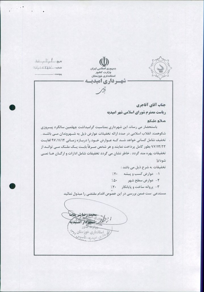 نامه شماره فوق مبنی بر اینکه شهرداری درنظر دارد به مناسبت گرامیداشت چهلمین سالگرد پیروزی شکوهمند انقلاب اسلامی و دهه مبارکۀ فجر درصدد ارائه تخفیفات عوارض ذیل به شهروندان در بازه زمانی ۱۲/۱۱/۹۷ لغایت ۲۲/۱۲/۹۷می باشد که موضوع در جلسه مطرح و پس از بحث و بررسی با مجموع آراء ذیل مصوب گردید%