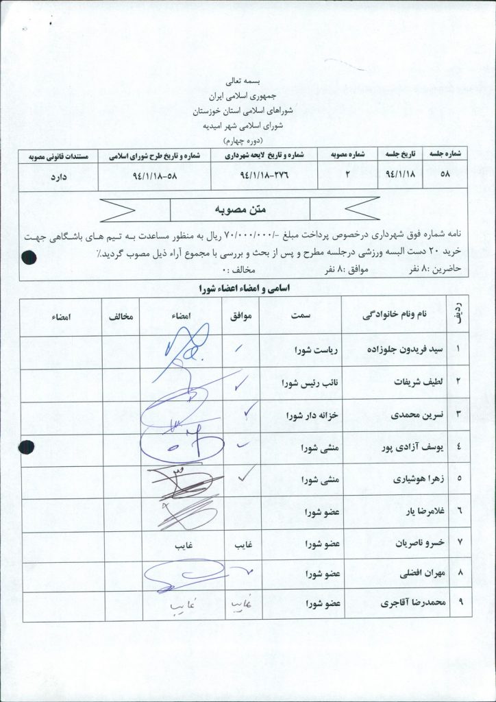مصوبه شماره ۲ جلسه شماره ۵۸ شورای اسلامی شهر امیدیه