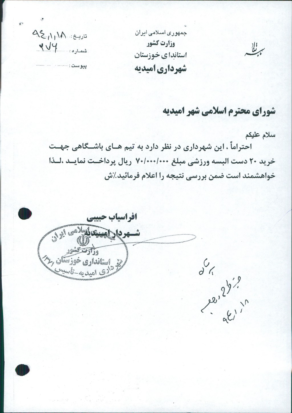 نامه شماره فوق شهرداری درخصوص پرداخت مبلغ ۷۰۰۰۰۰۰ ریال به منظور مساعدت به تیم های باشگاهی جهت خرید ۲۰ دست البسه ورزشی درجلسه مطرح و پس از بحث و بررسی با مجموع آراء ذیل مصوب گردید%