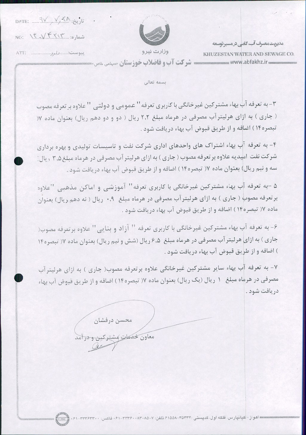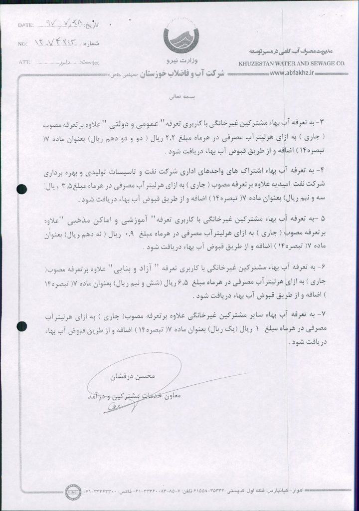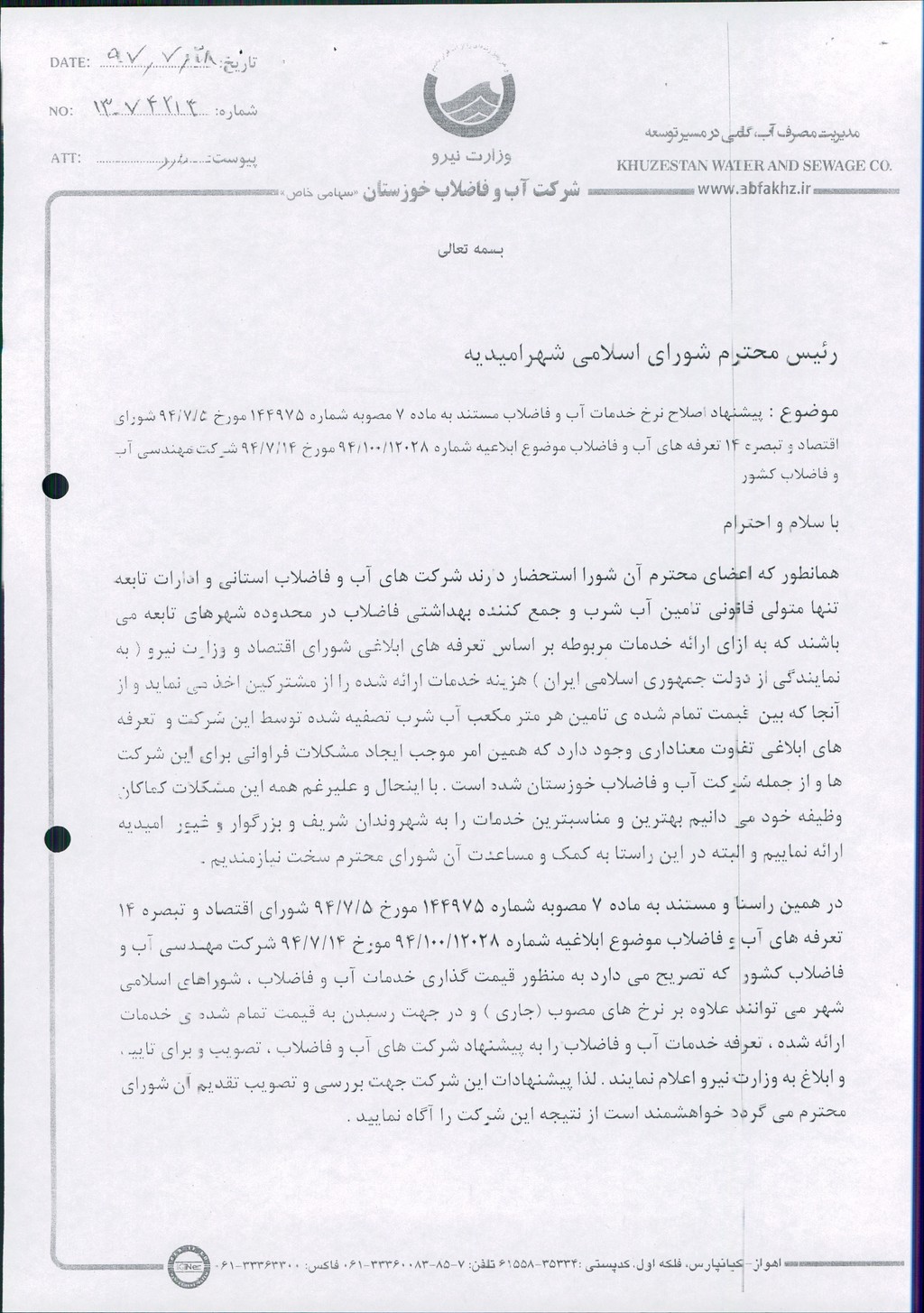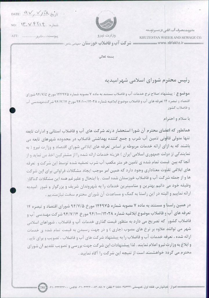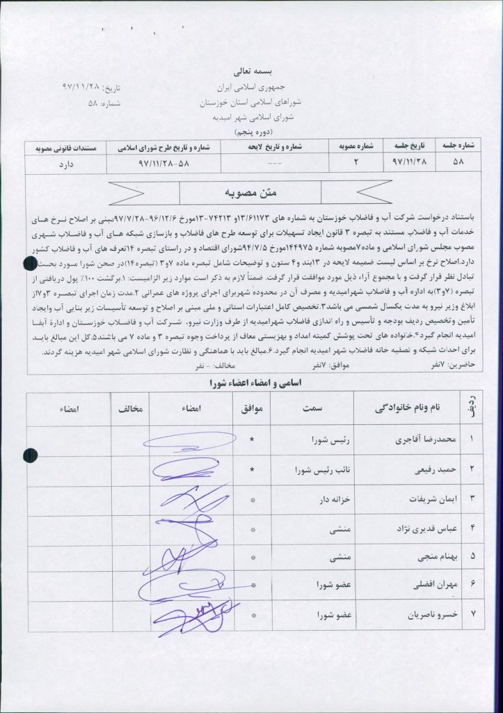 باستناد درخواست شرکت آب و فاضلاب خوزستان به شماره های ۶۱۱۷۳/۱۳و ۷۴۲۱۳-۱۳مورخ ۶/۱۲/۹۶-۲۸/۷/۹۷مبنی بر اصلاح نرخ های خدمات آب و فاضلاب مستند به تبصره ۳ قانون ایجاد تسهیلات برای توسعه طرح های فاضلاب و بازسازی شبکه های آب و فاضلاب شهری مصوب مجلس شورای اسلامی و ماده۷مصوبه شماره ۱۴۴۹۷۵مورخ ۵/۷/۹۴شورای اقتصاد و در راستای تبصره ۱۴تعرفه های آب و فاضلاب کشور دارد.اصلاح نرخ بر اساس لیست ضمیمه لایحه در ۱۳بند و۴ ستون و توضیحات شامل تبصره ماده ۷و۳ (تبصره۱۴)در صحن شورا مورد بحث و تبادل نظر قرار گرفت و با مجموع آراء ذیل مورد موافقت قرار گرفت. ضمناً لازم به ذکر است موارد زیر الزامیست: ۱٫برگشت ۱۰۰% پول دریافتی از تبصره (۷و۳)به اداره آب و فاضلاب شهرامیدیه و مصرف آن در محدوده شهربرای اجرای پروژه های عمرانی ۲٫مدت زمان اجرای تبصره ۳و۷از ابلاغ وزیر نیرو به مدت یکسال شمسی می باشد۳٫تخصیص کامل اعتبارات استانی و ملی مبنی بر اصلاح و توسعه تأسیسات زیر بنایی آب وایجاد تأمین وتخصیص ردیف بودجه و تأسیس و راه اندازی فاضلاب شهرامیدیه از طرف وزارت نیرو، شرکت آب و فاضلاب خوزستان و ادارۀ آبفا امیدیه انجام گیرد۴٫خانواده های تحت پوشش کمیته امداد و بهزیستی معاف از پرداخت وجوه تبصره ۳ و ماده ۷ می باشند۵٫کل این مبالغ باید برای احداث شبکه و تصفیه خانه فاضلاب شهر امیدیه انجام گیرد.۶٫مبالغ باید با هماهنگی و نظارت شورای اسلامی شهر امیدیه هزینه گردند.