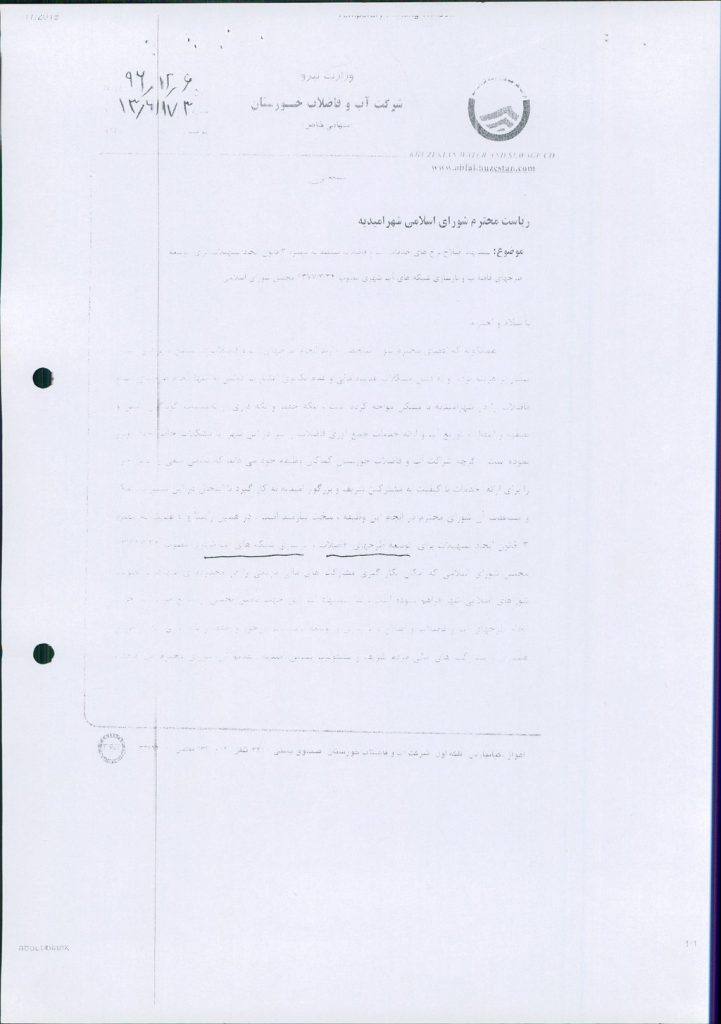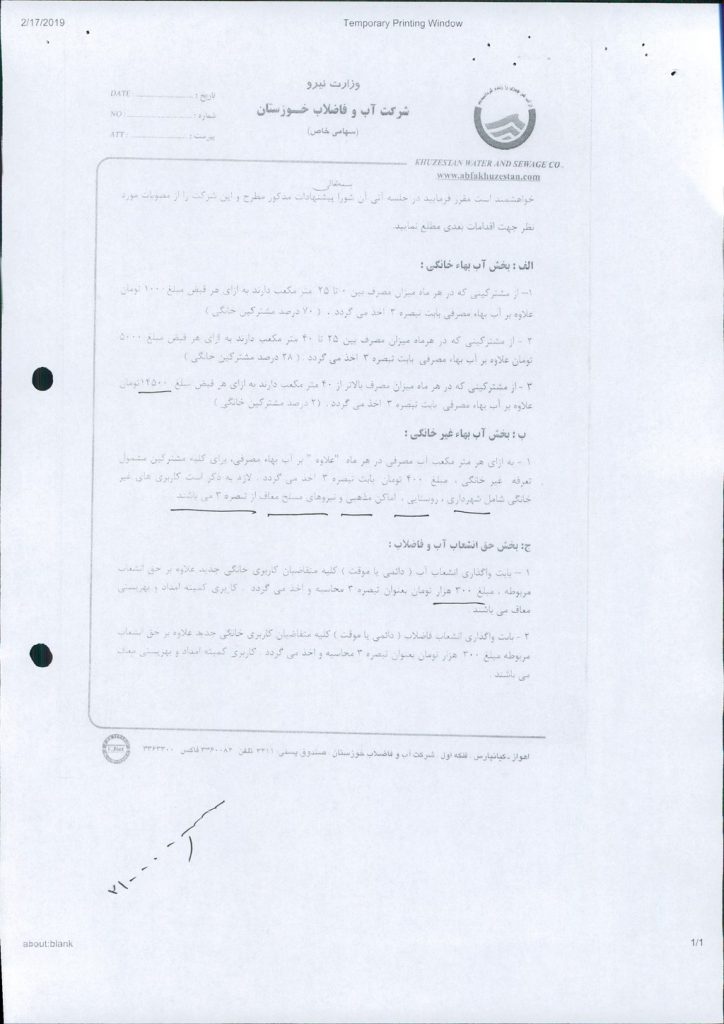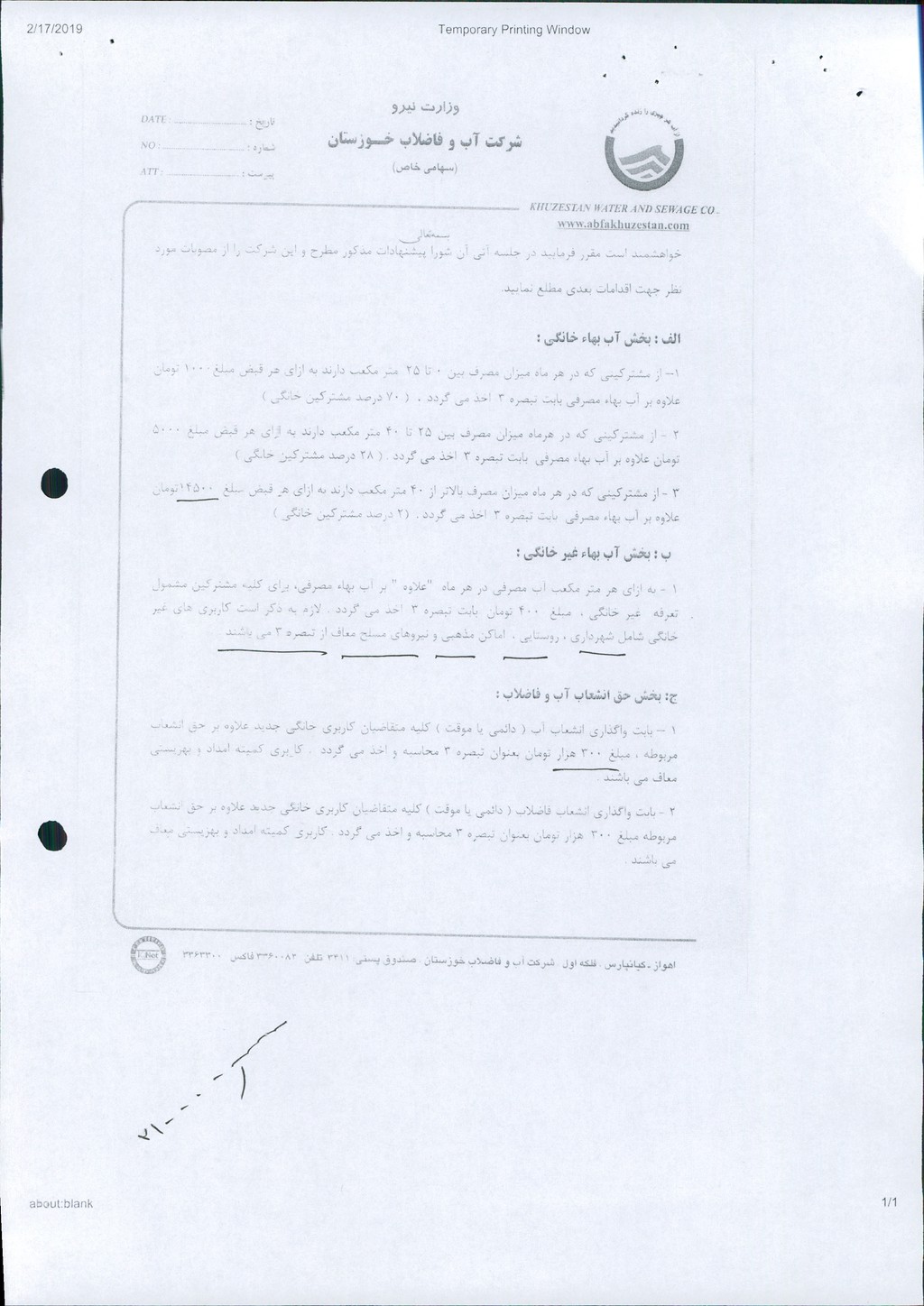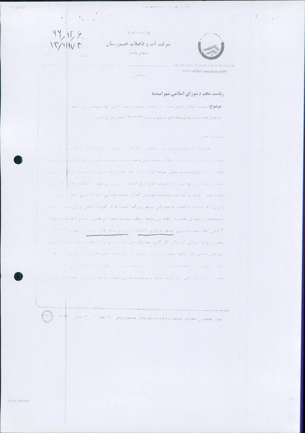 باستناد درخواست شرکت آب و فاضلاب خوزستان به شماره های ۶۱۱۷۳/۱۳و ۷۴۲۱۳-۱۳مورخ ۶/۱۲/۹۶-۲۸/۷/۹۷مبنی بر اصلاح نرخ های خدمات آب و فاضلاب مستند به تبصره ۳ قانون ایجاد تسهیلات برای توسعه طرح های فاضلاب و بازسازی شبکه های آب و فاضلاب شهری مصوب مجلس شورای اسلامی و ماده۷مصوبه شماره ۱۴۴۹۷۵مورخ ۵/۷/۹۴شورای اقتصاد و در راستای تبصره ۱۴تعرفه های آب و فاضلاب کشور دارد.اصلاح نرخ بر اساس لیست ضمیمه لایحه در ۱۳بند و۴ ستون و توضیحات شامل تبصره ماده ۷و۳ (تبصره۱۴)در صحن شورا مورد بحث و تبادل نظر قرار گرفت و با مجموع آراء ذیل مورد موافقت قرار گرفت. ضمناً لازم به ذکر است موارد زیر الزامیست: ۱٫برگشت ۱۰۰% پول دریافتی از تبصره (۷و۳)به اداره آب و فاضلاب شهرامیدیه و مصرف آن در محدوده شهربرای اجرای پروژه های عمرانی ۲٫مدت زمان اجرای تبصره ۳و۷از ابلاغ وزیر نیرو به مدت یکسال شمسی می باشد۳٫تخصیص کامل اعتبارات استانی و ملی مبنی بر اصلاح و توسعه تأسیسات زیر بنایی آب وایجاد تأمین وتخصیص ردیف بودجه و تأسیس و راه اندازی فاضلاب شهرامیدیه از طرف وزارت نیرو، شرکت آب و فاضلاب خوزستان و ادارۀ آبفا امیدیه انجام گیرد۴٫خانواده های تحت پوشش کمیته امداد و بهزیستی معاف از پرداخت وجوه تبصره ۳ و ماده ۷ می باشند۵٫کل این مبالغ باید برای احداث شبکه و تصفیه خانه فاضلاب شهر امیدیه انجام گیرد.۶٫مبالغ باید با هماهنگی و نظارت شورای اسلامی شهر امیدیه هزینه گردند.