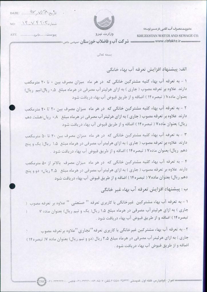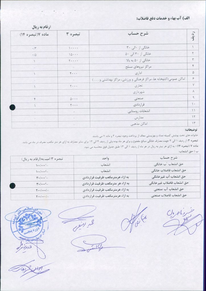 تبصره ۳: از ردیف ۱ الی ۳ جهت مصارف خانگی مبالغ مقطوع و برای هر ماه بوده ولی از ردیف ۴ الی ۱۳ برای سایر مصارف به ازای هر متر مکعب مصرف در ماه می باشد.