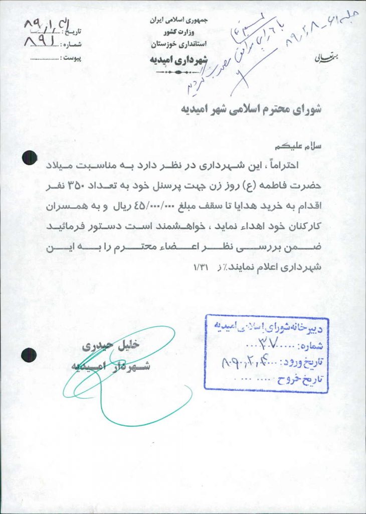 نامه شماره فوق شهرداری در خصوص خرید هدایا برای همسران کارکنان شهرداری( تعداد ۳۵۰ نفر) تا سقف مبلغ ۴۵/۰۰۰/۰۰۰ ریال به مناسبت میلادحضرت فاطمه (س )و (روز زن) بود که پس از بحث و بررسی با مجموع آراء ذیل مصوب گردید%