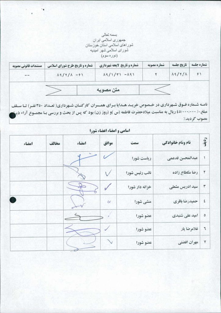 مصوبه شماره ۲ جلسه شماره ۶۱ شورای اسلامی شهر امیدیه