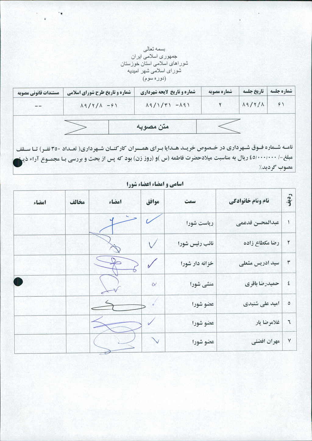 مصوبه شماره ۲ جلسه شماره ۶۱ مورخ ۸۹/۲/۸ شورای اسلامی شهر امیدیه