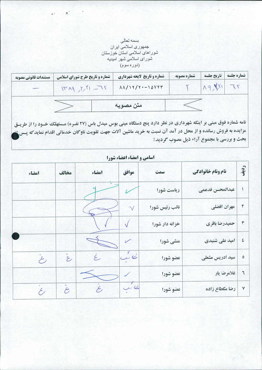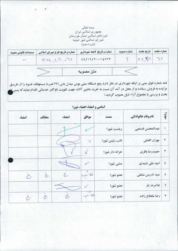 مصوبه شماره ۲ جلسه شماره ۶۲ شورای اسلامی شهر امیدیه