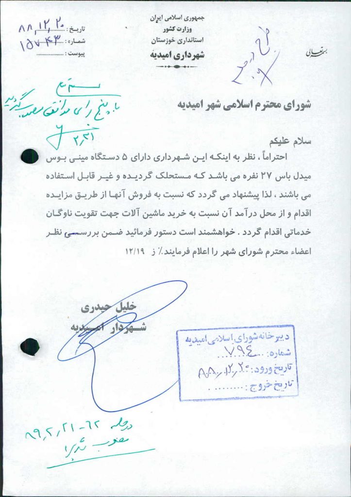 نامه شماره فوق مبنی بر اینکه شهرداری در نظر دارد پنج دستگاه مینی بوس میدل باس (۲۷ نفره) مستهلک خود را از طریق مزایده به فروش رسانده و از محل در آمد آن نسبت به خرید ماشین آلات جهت تقویت ناوگان خدماتی اقدام نمایدکه پس از بحث و بررسی با مجموع آراء ذیل مصوب گردید%