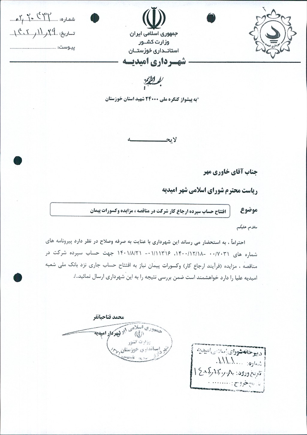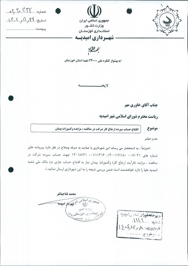 لایحه شماره فوق مبنی بر اینکه شهرداری امیدیه در نظر دارد به لحاظ صرفه و صلاح و به منظور سپرده شرکت در مناقصه ،مزایده (فرآیند ارجاع کار) و کسورات پیمان اقدام به افتتاح حساب جاری نزد بانک ملی شعبه امیدیه علیاء نماید، موضوع در جلسه مطرح و پس از بحث و بررسی با مجموع آراء ذیل مصوب گردید.