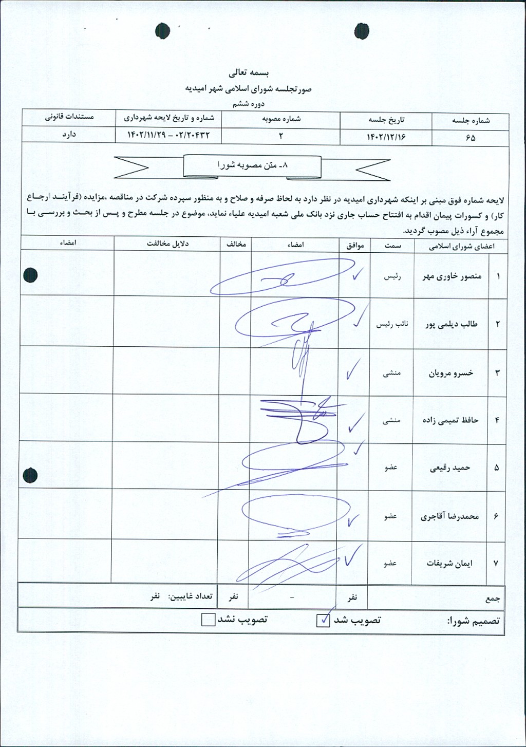 مصوبه شماره ۲ جلسه شماره ۶۵ شورای اسلامی شهر امیدیه