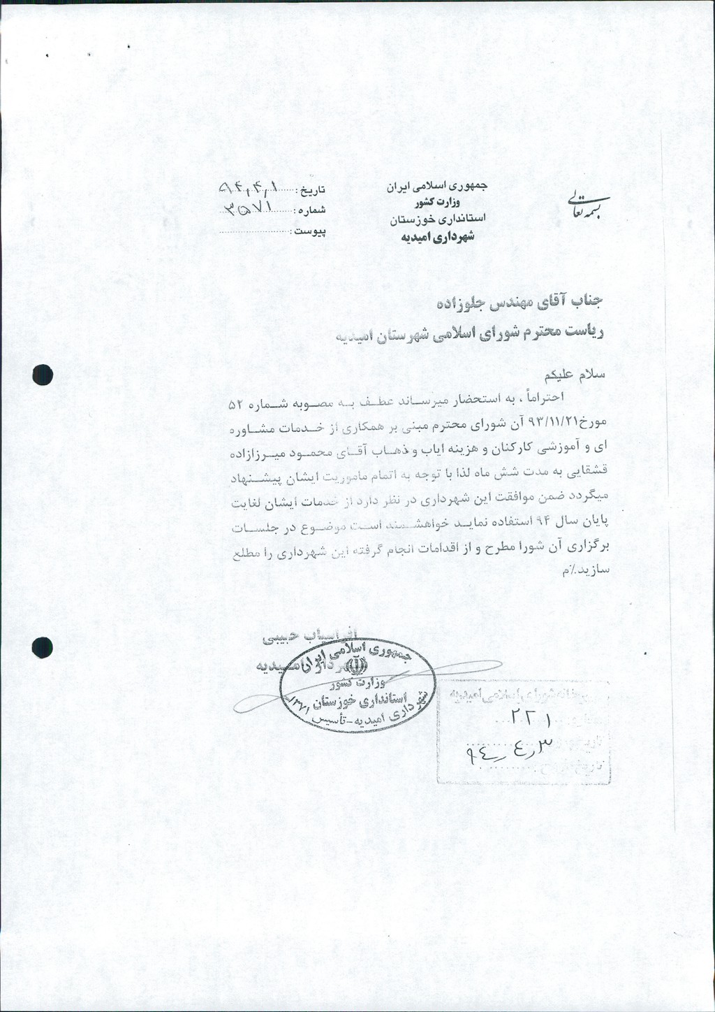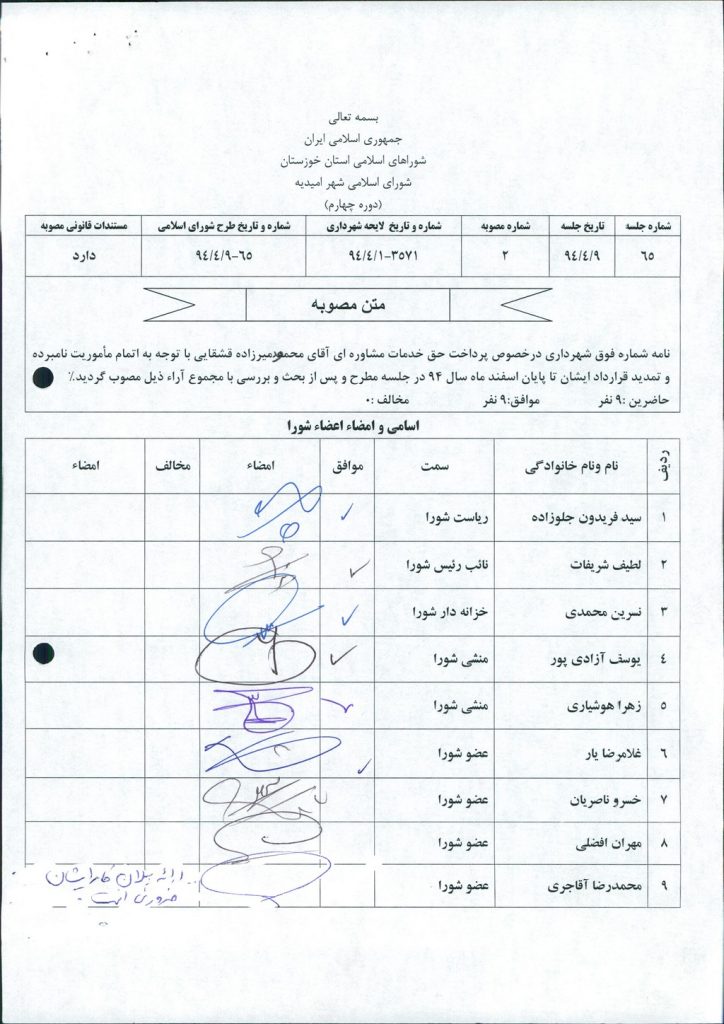 مصوبه شماره ۲ جلسه شماره ۶۵ شورای اسلامی شهر امیدیه