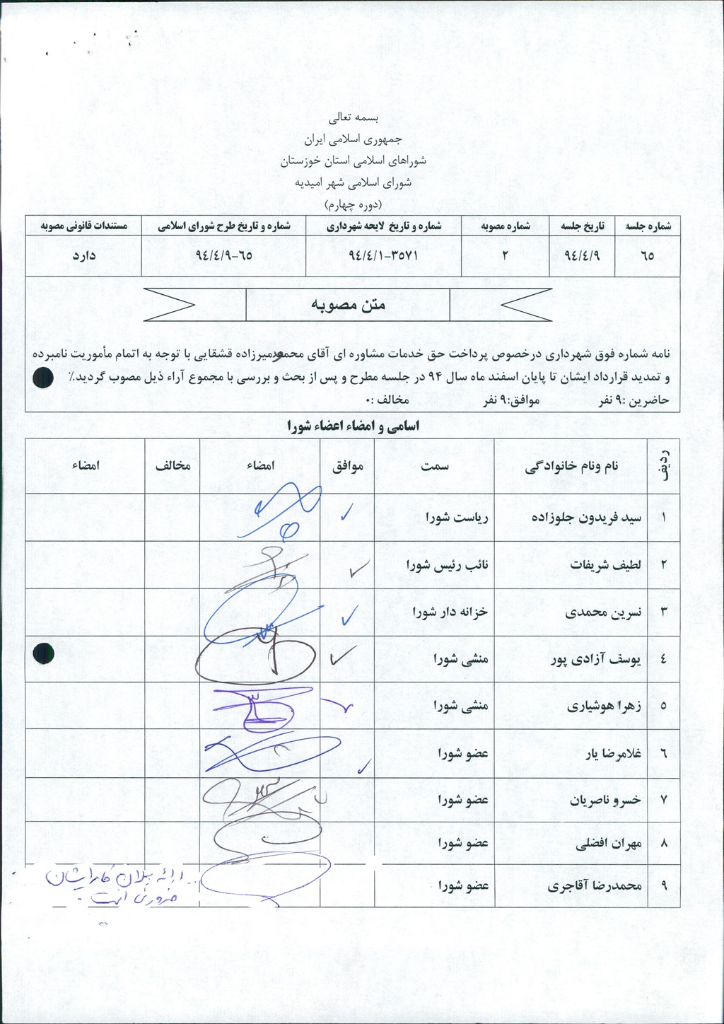 نامه شماره فوق شهرداری درخصوص پرداخت حق خدمات مشاوره ای آقای محمود میرزاده قشقایی با توجه به اتمام مأموریت نامبرده و تمدید قرارداد ایشان تا پایان اسفند ماه سال ۹۴ در جلسه مطرح و پس از بحث و بررسی با مجموع آراء ذیل مصوب گردید%