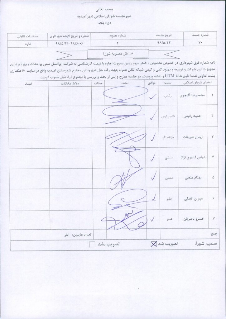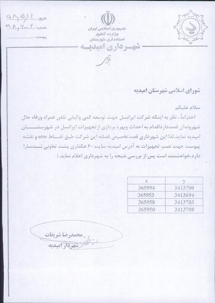 نامه شماره فوق شهرداری در خصوص تخصیص ۱۰۰متر مربع زمین بصورت اجاره با قیمت کارشناسی به شرکت ایرانسل مبنی براحداث و بهره برداری تجهیزات این شرکت و توسعه و بهبود کمی و کیفی شبکه تلفن همراه جهت رفاه حال شهروندان محترم شهرستان امیدیه واقع در سایت ۶۰ هکتاری پشت تعاونی ندسا طبق نقاط UTM و نقشه پیوست، در جلسه مطرح و پس از بحث و بررسی با مجموع آراء ذیل مصوب گردید.