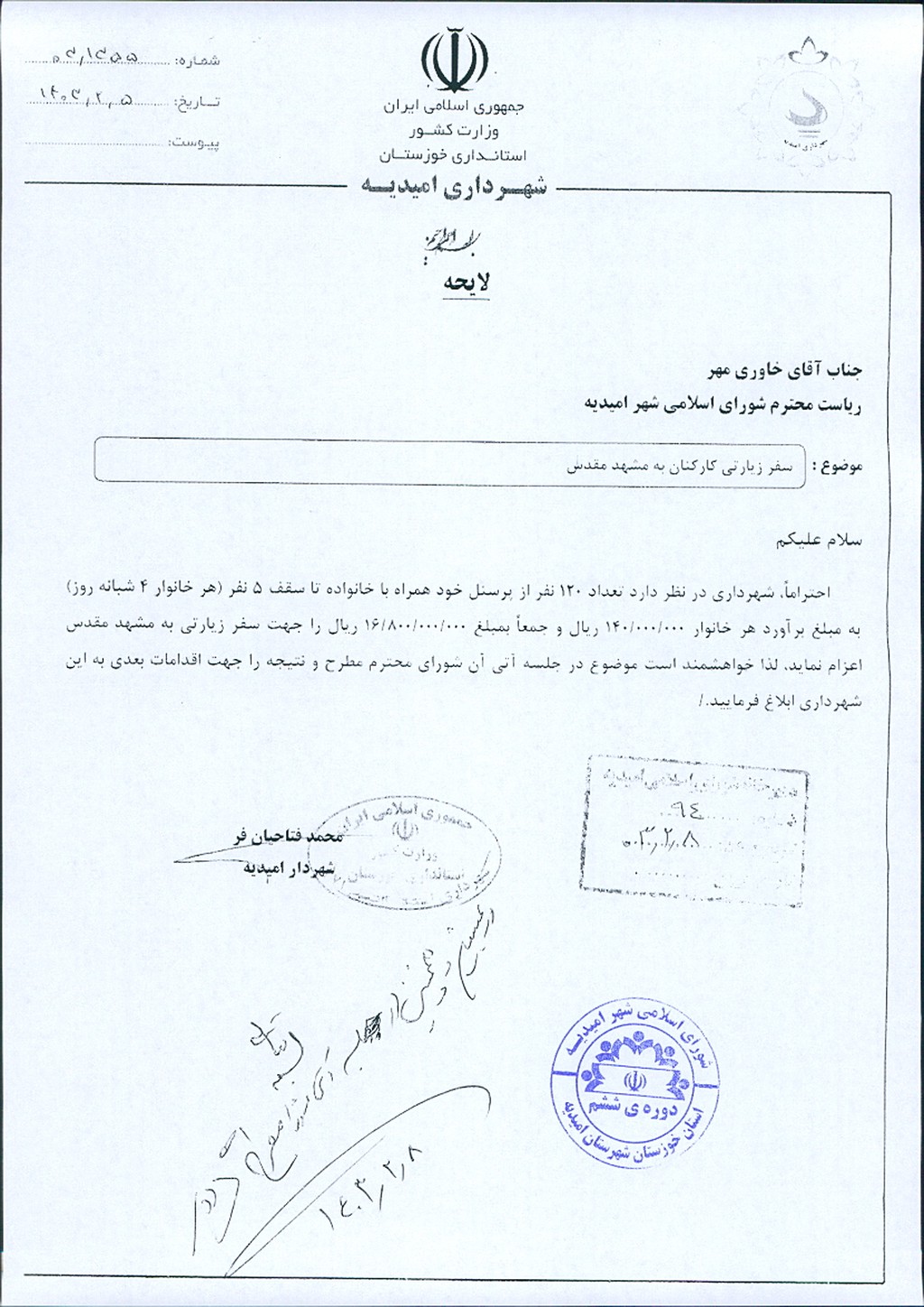 نامه شماره فوق مبنی بر اینکه شهرداری در نظر دارد، تعداد ۱۲۰ خانواراز پرسنل خود به همراه افراد درجه یک خانواده حداکثربه تعدادپنج نفر به مبلغ برآورد هر خانوار یک شبانه روز به مبلغ ۰۰۰/۰۰۰/ ۳۵ ریال و به تعداد حداکثرچهار شبانه روز جمعاً به مبلغ ۰۰۰/۰۰۰/ ۸۰۰/ ۱۶ ریال را جهت سفر زیارتی به مشهد مقدس پرداخت نماید، موضوع در جلسه مطرح و با توجه به بحث و بررسی آن در کمیسیون با مجموع آراء ذیل و با رعایت موارد ذیل مصوب گردید: ۱-انتخاب هتل به نحوی باشد که شأن و منزلت کارکنان شهرداری حفظ و خدمات رسانی و رفاهیات پرسنل به نحو شایسته صورت پذیرد و حتی المقدور نزدیک به حرم مطهر باشد ۲-آمار دقیق افراد اعزامی شامل نیروهای شهرداری و افراد درجه یک آنان به مدیریت هتل ارسال و نسخه ای از آن به شورای اسلامی شهر ارسال گردد۳-نظارت کامل از سوی نماینده شهرداری در کلیه زمینه ها صورت گرفته و گزارش آن بصورت مرتب به شهرداری و شورای اسلامی شهر ارسال گردد۴-اولویت اعزام با افرادی باشد که در سنوات گذشته از سهمیه استفاده ننموده اند.