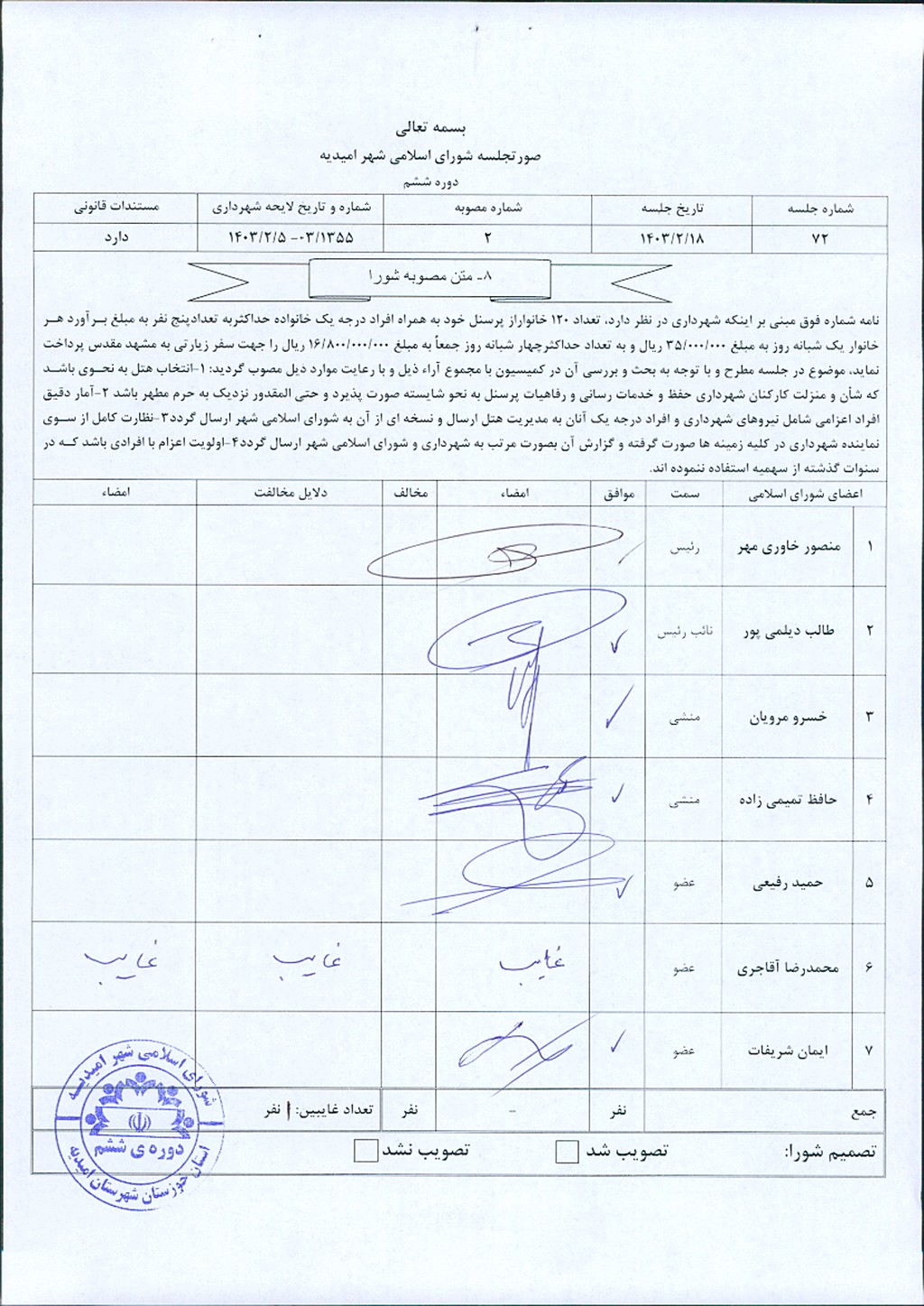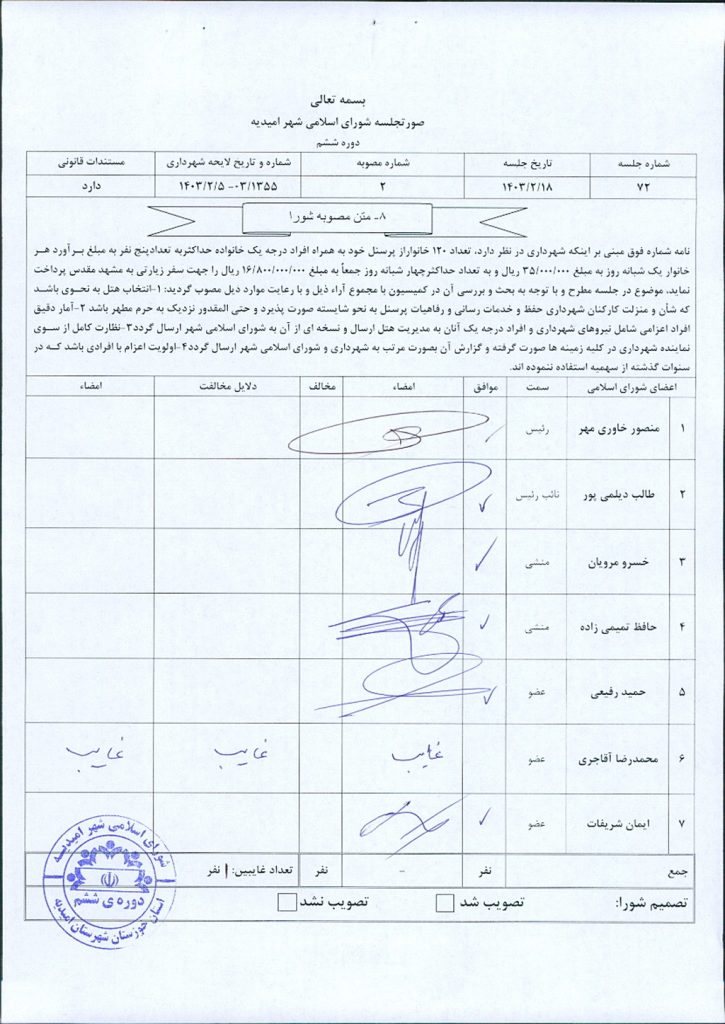 مصوبه شماره ۲ جلسه شماره ۷۲ شورای اسلامی شهر امیدیه