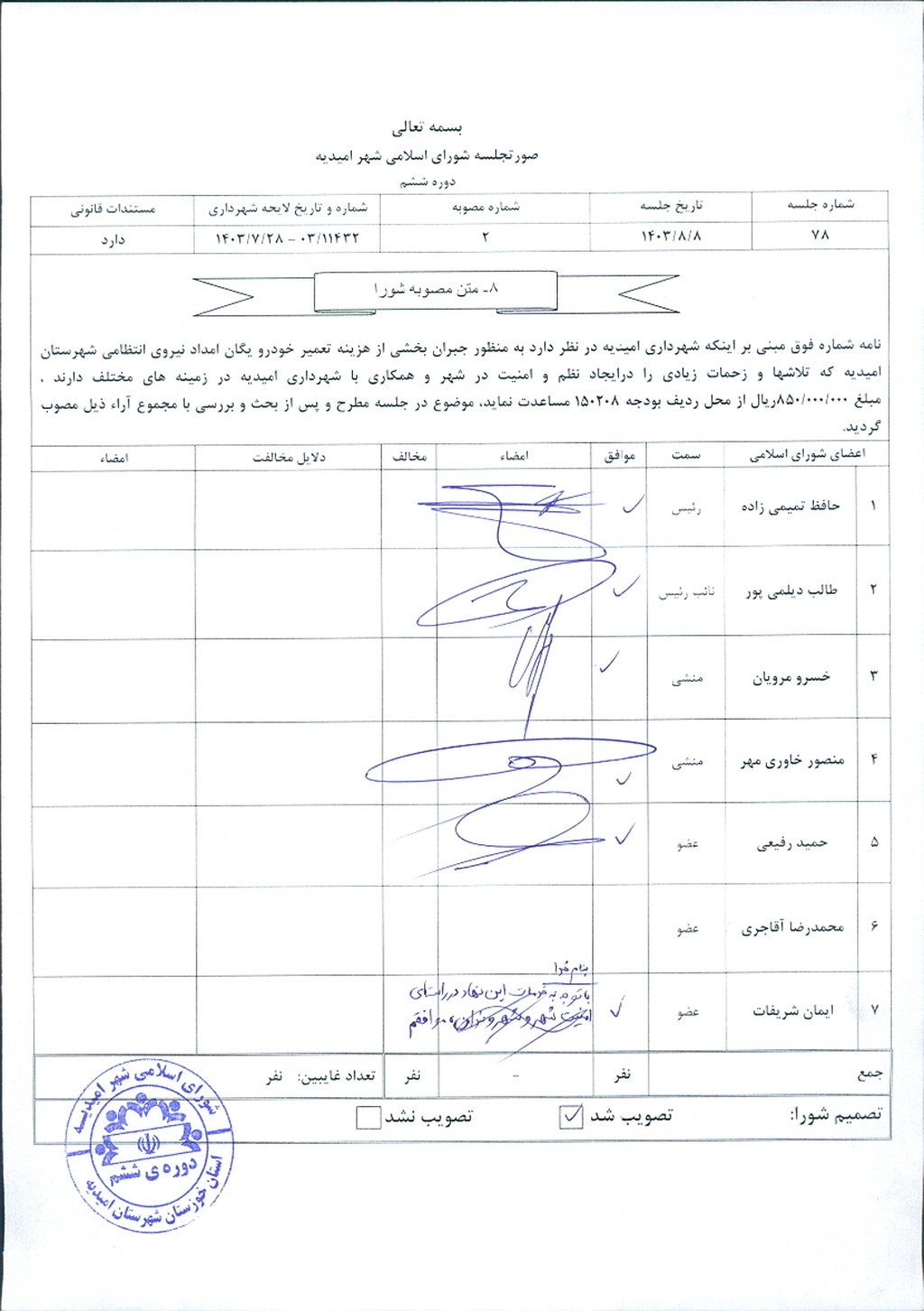 مصوبه شماره ۲ جلسه شماره ۷۸ مورخ ۱۴۰۳/۸/۸ شورای اسلامی شهر امیدیه