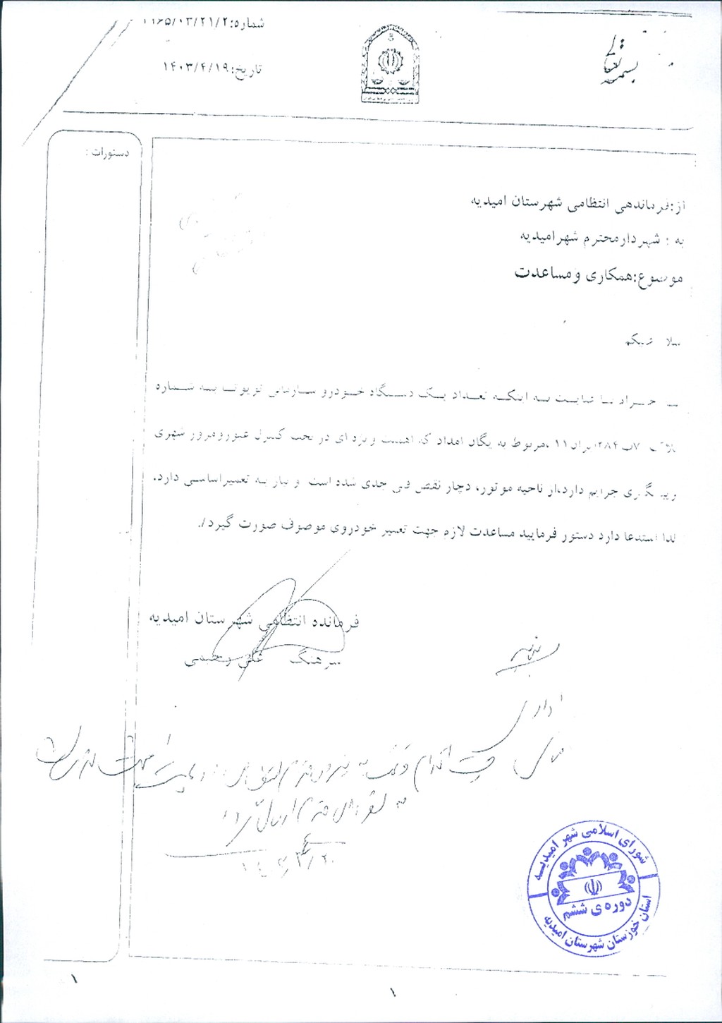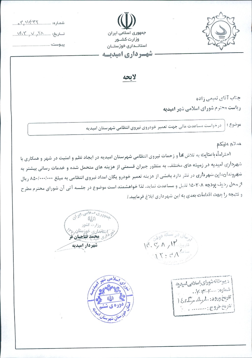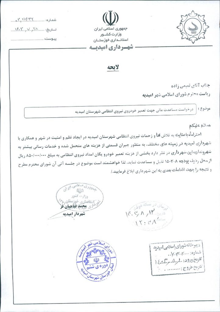 نامه شماره فوق مبنی بر اینکه شهرداري امیدیه در نظر دارد به منظور جبران بخشی از هزینه تعمیر خودرو یگان امداد نیروی انتظامی شهرستان امیدیه که تلاشها و زحمات زیادی را درایجاد نظم و امنیت در شهر و همکاری با شهرداری امیدیه در زمینه های مختلف دارند مبلغ ۰۰۰/۰۰۰/ ۸۵۰ ریال از محل ردیف بودجه ۱۵۰۲۰۸ مساعدت نماید، موضوع در جلسه مطرح و پس از بحث و بررسي با مجموع آراء ذيل مصوب گرديد.