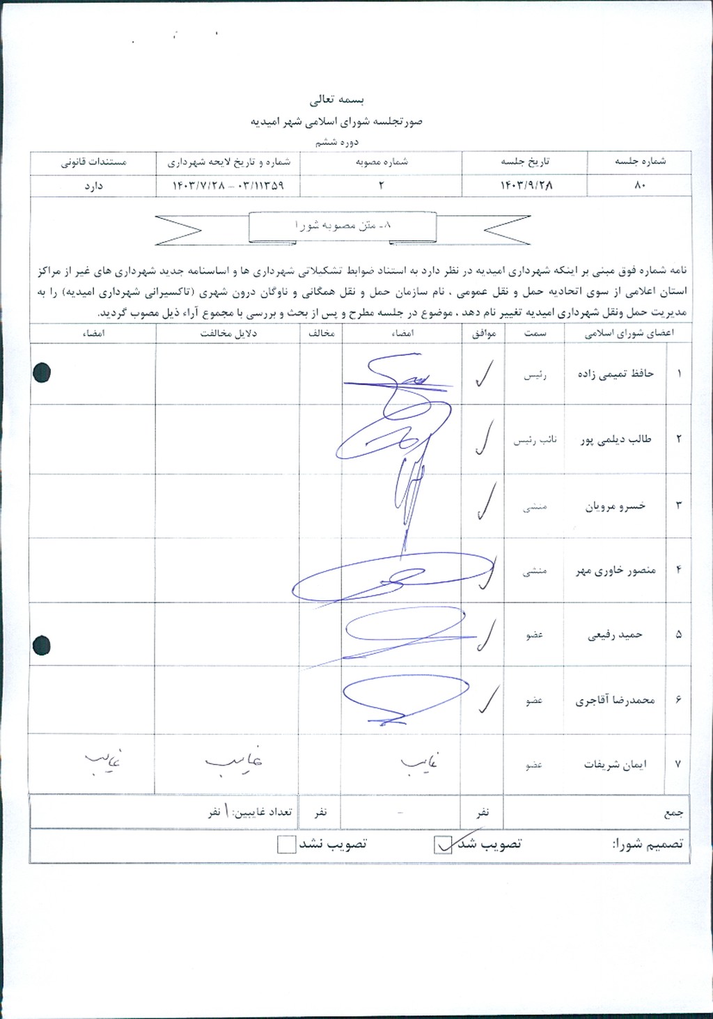 مصوبه شماره ۲ جلسه شماره ۸۰ شورای اسلامی شهر امیدیه