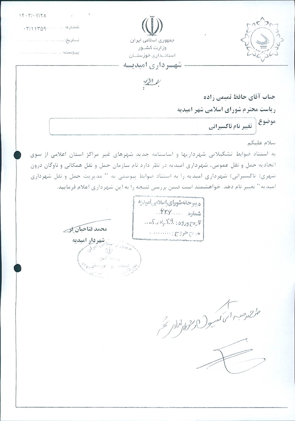 نامه شماره فوق مبنی بر اینکه شهرداري امیدیه در نظر دارد به استناد ضوابط تشکیلاتی شهرداری ها و اساسنامه جدید شهرداری های غیر از مراکز استان اعلامی از سوی اتحادیه حمل و نقل عمومی ، نام سازمان حمل و نقل همگانی و ناوگان درون شهری (تاکسیرانی شهرداری امیدیه) را به مدیریت حمل ونقل شهرداری امیدیه تغییر نام دهد ، موضوع در جلسه مطرح و پس از بحث و بررسي با مجموع آراء ذيل مصوب گرديد
