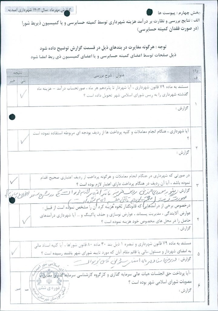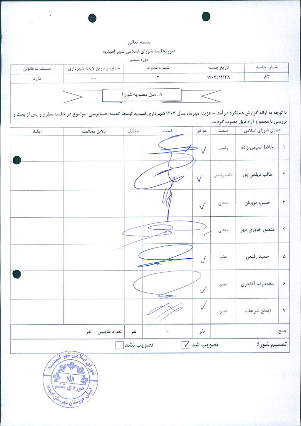 با توجه به ارائه گزارش عملکرد درآمد – هزینه مهرماه سال ۱۴۰۳ شهرداری امیدیه توسط کمیته حسابرسی، موضوع در جلسه مطرح و پس از بحث و بررسي با مجموع آراء ذيل مصوب گرديد.