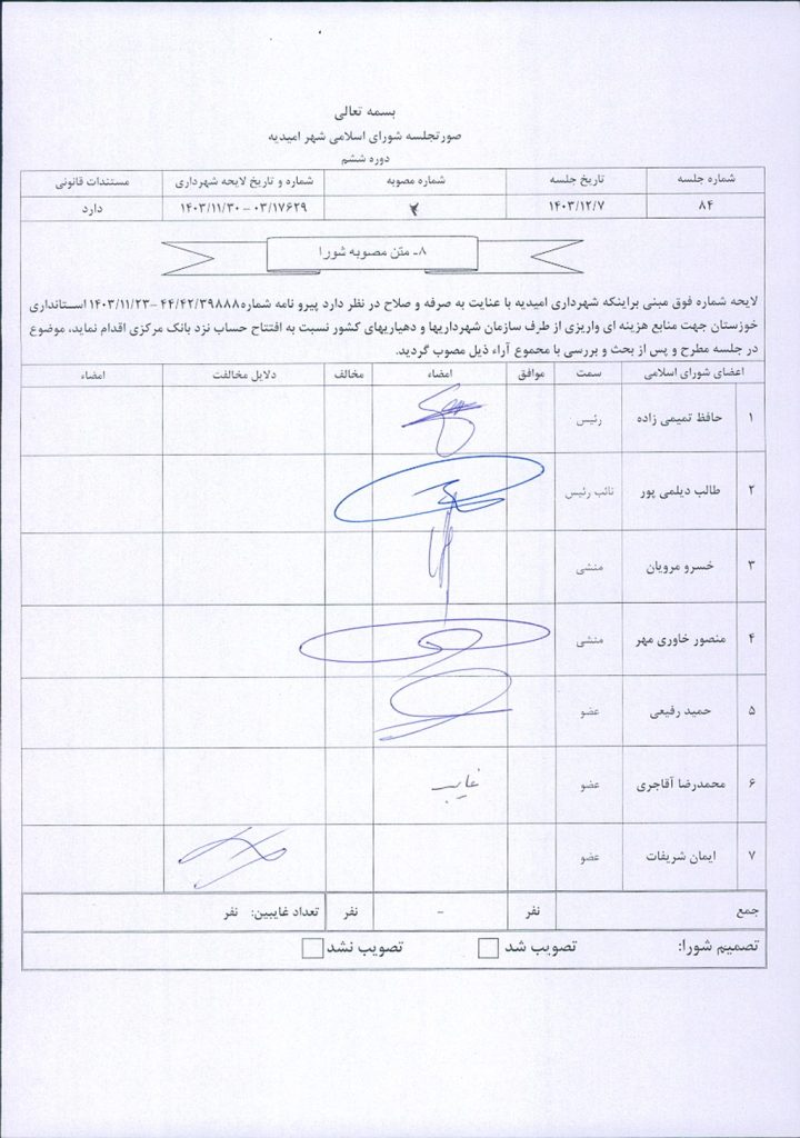 مصوبه شماره ۲ جلسه شماره ۸۴ شورای اسلامی شهر امیدیه