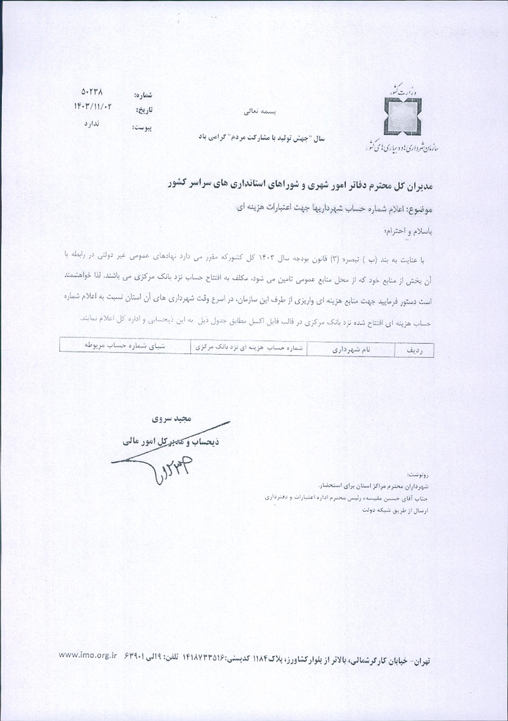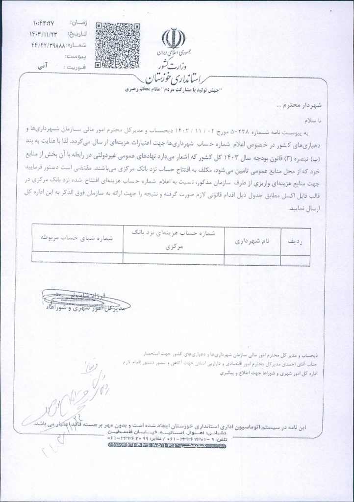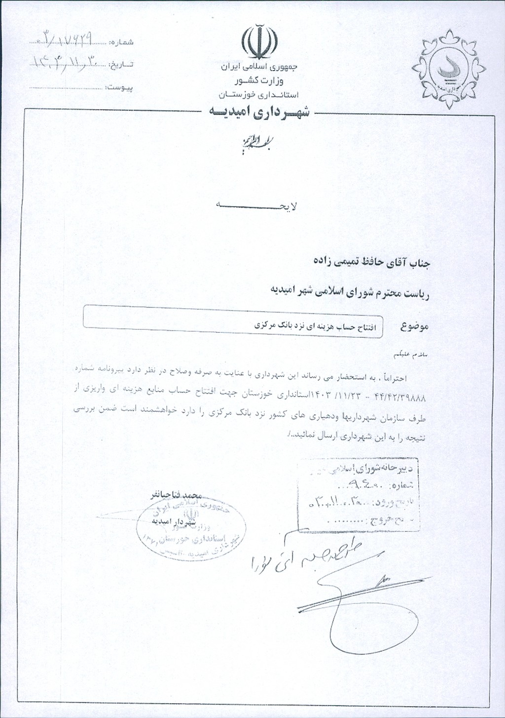 لایحه شماره فوق مبنی براینکه شهرداری امیدیه با عنایت به صرفه و صلاح در نظر دارد پیرو نامه شماره۳۹۸۸۸/ ۴۲/ ۴۴ –۲۳/ ۱۱/ ۱۴۰۳ استانداری خوزستان جهت منابع هزینه ای واریزی از طرف سازمان شهرداریها و دهیاریهای کشور نسبت به افتتاح حساب نزد بانک مرکزی اقدام نماید، موضوع در جلسه مطرح و پس از بحث و بررسی با مجموع آراء ذیل مصوب گردید.