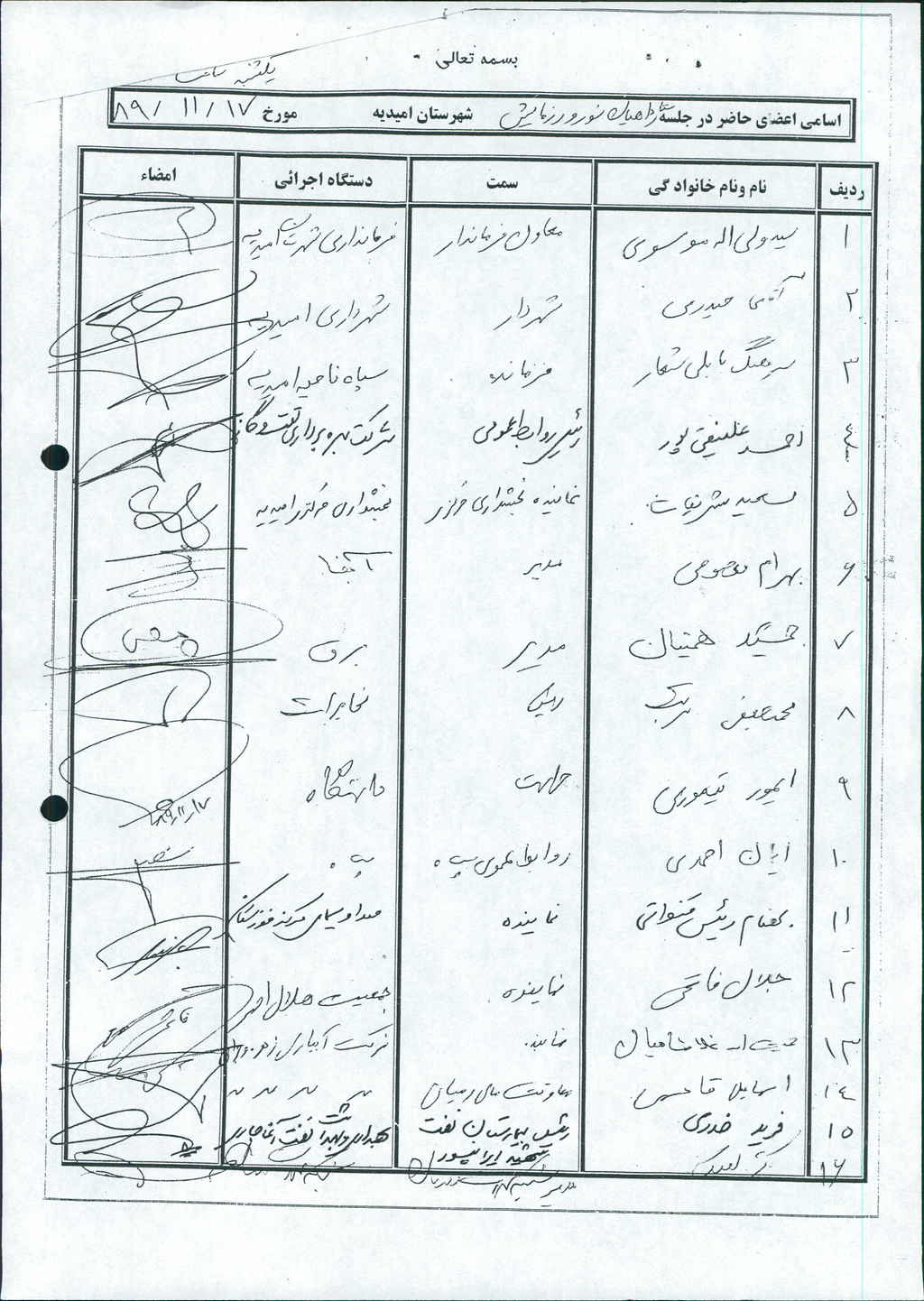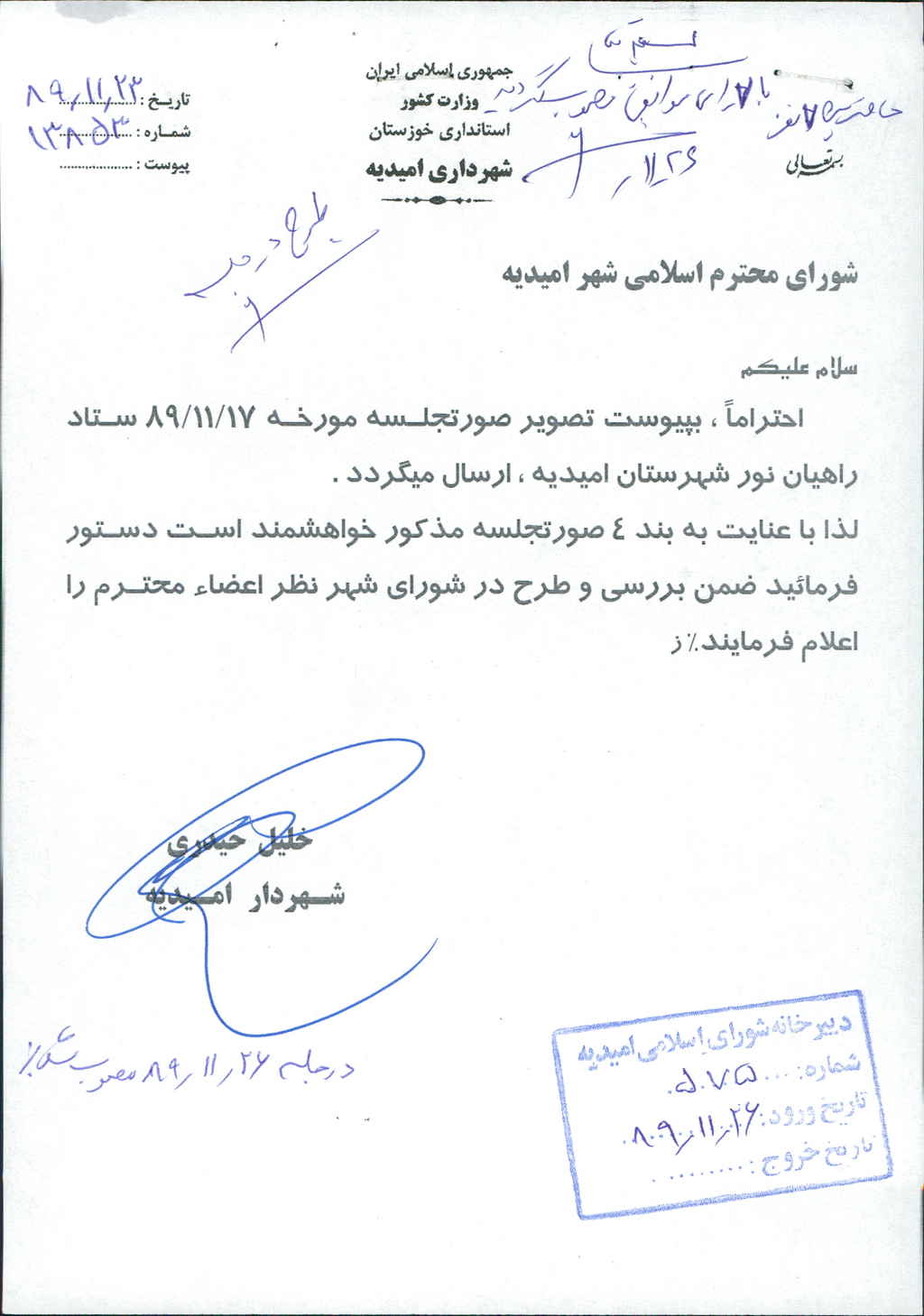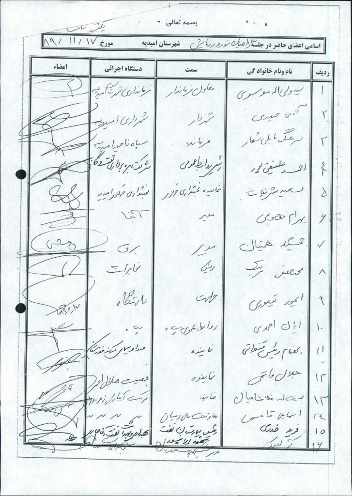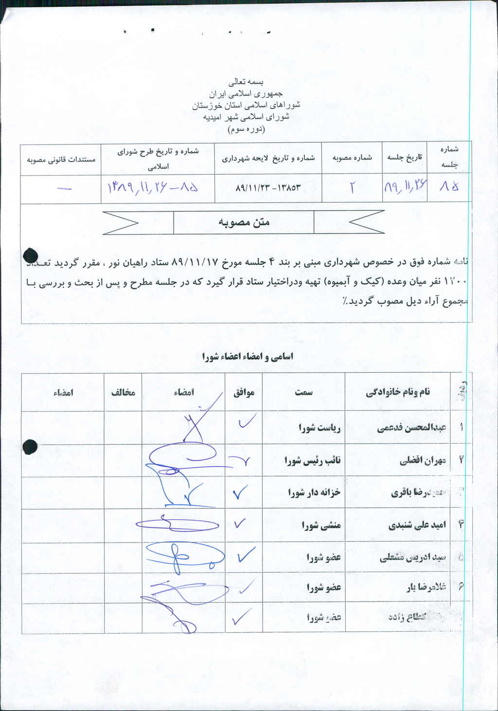 مصوبه شماره ۲ جلسه شماره ۸۵ مورخ ۸۹/۱۱/۲۶ شورای اسلامی شهر امیدیه