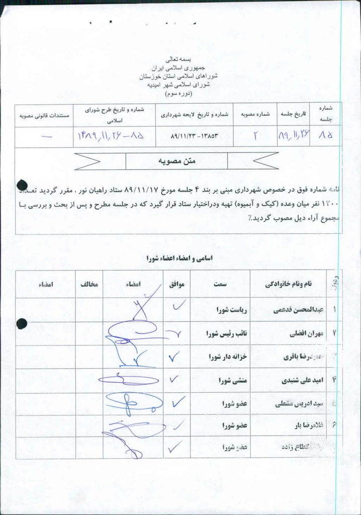 مصوبه شماره ۲ جلسه شماره ۸۵ شورای اسلامی شهر امیدیه