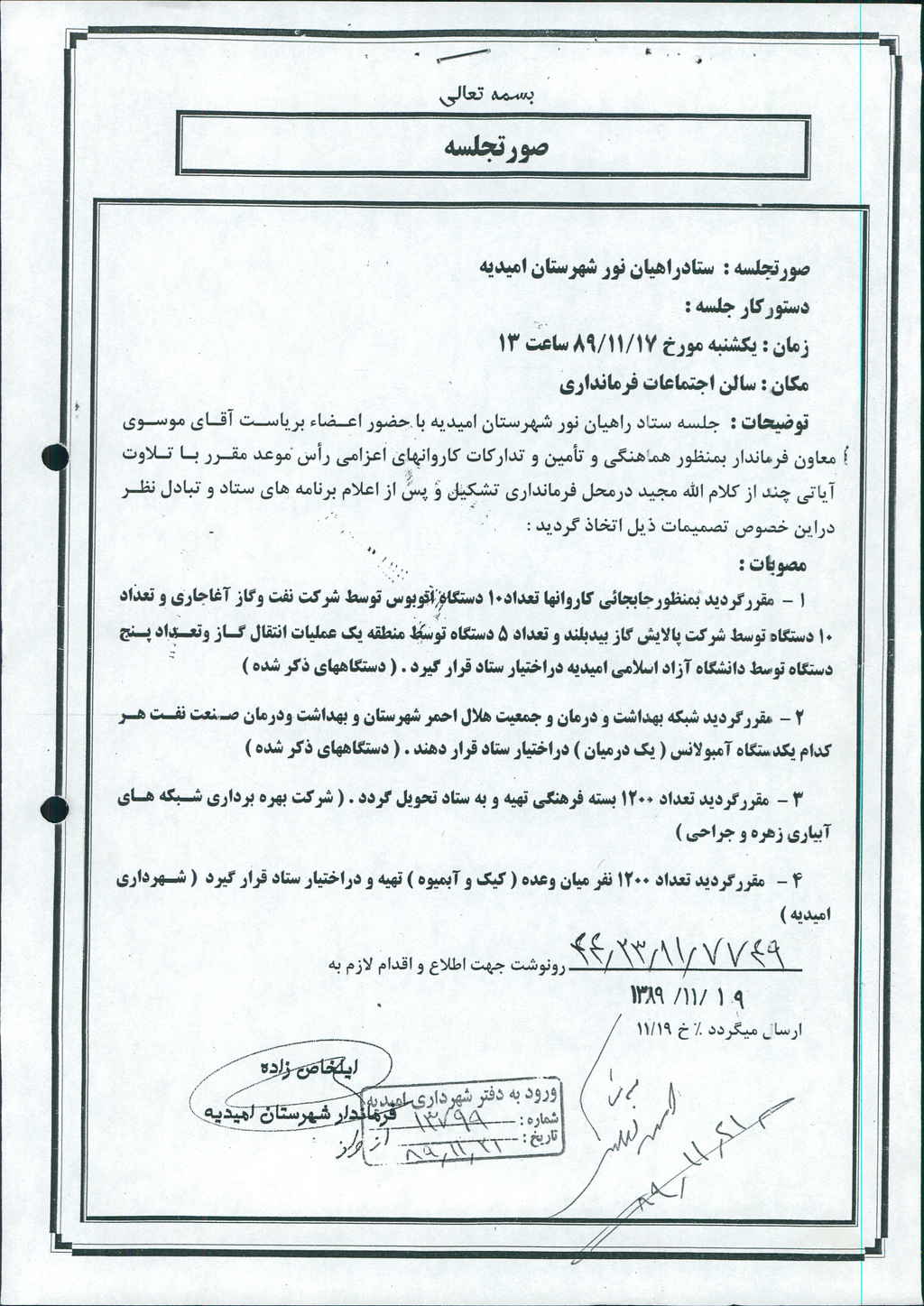 نامه شماره فوق در خصوص شهرداری مبنی بر با عنایت به بند ۴ جلسه مورخ ۸۹/۱۱/۱۷ ستاد راهیان نور ، مقرر گردید تعداد ۱۲۰۰ نفر میان وعده (کیک و آبمیوه) تهیه ودراختیار ستاد قرار گیرد که در جلسه مطرح و پس از بحث و بررسی با مجموع آراء ذیل مصوب گردید%