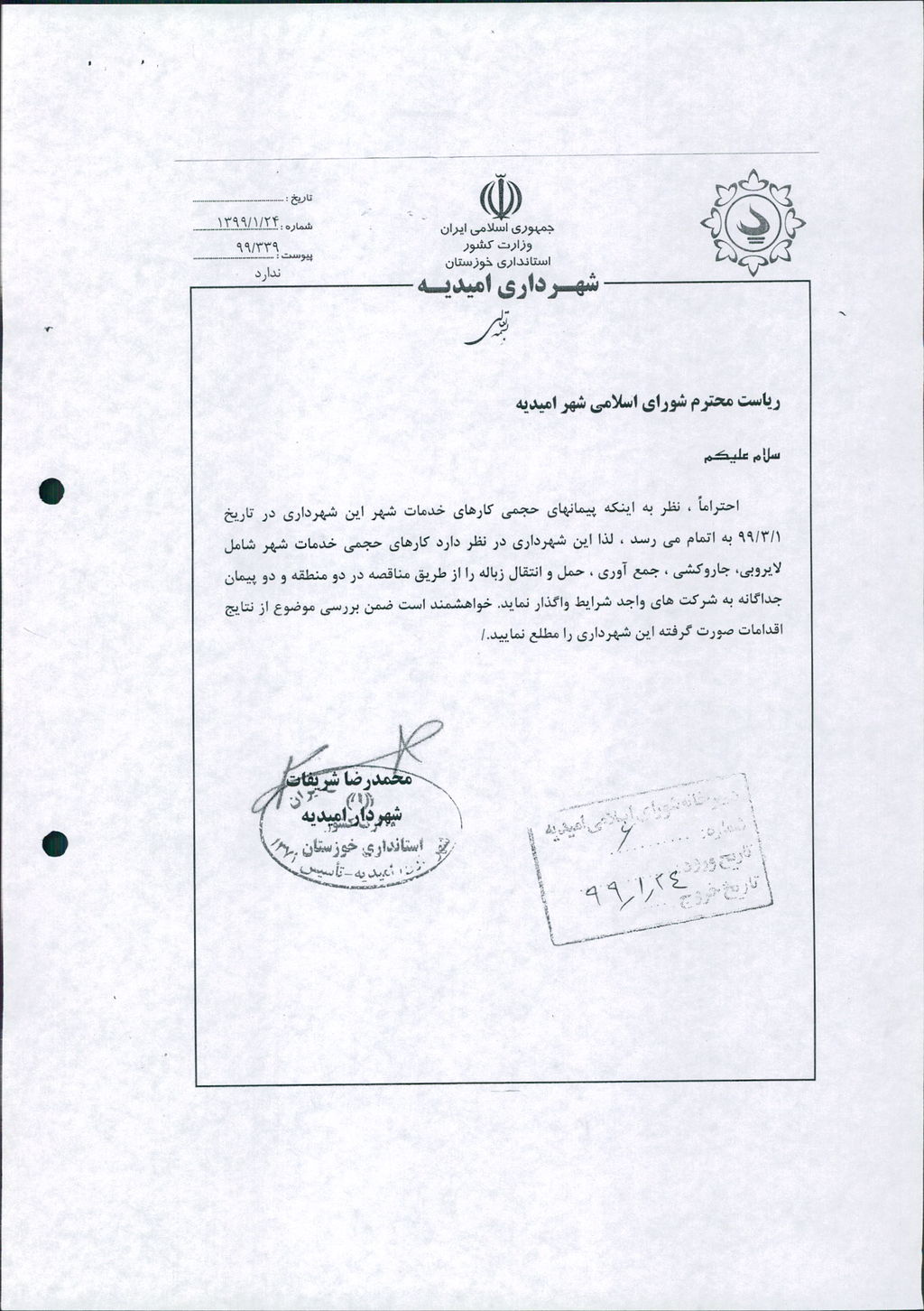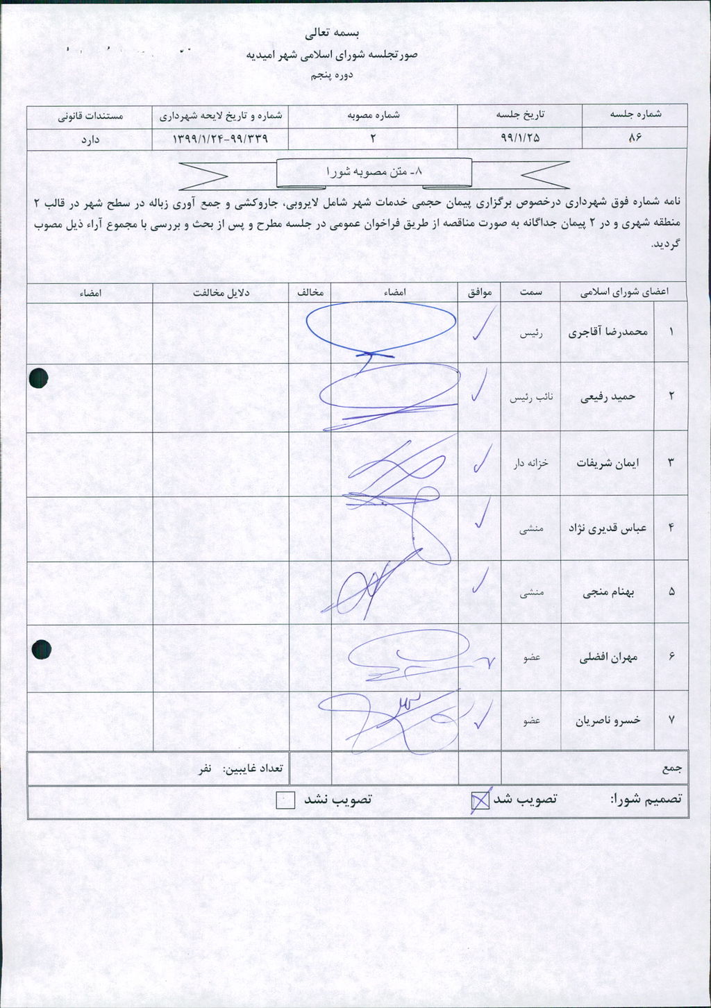 مصوبه شماره ۲ جلسه شماره ۸۶ مورخ ۹۹/۱/۲۵ شورای اسلامی شهر امیدیه