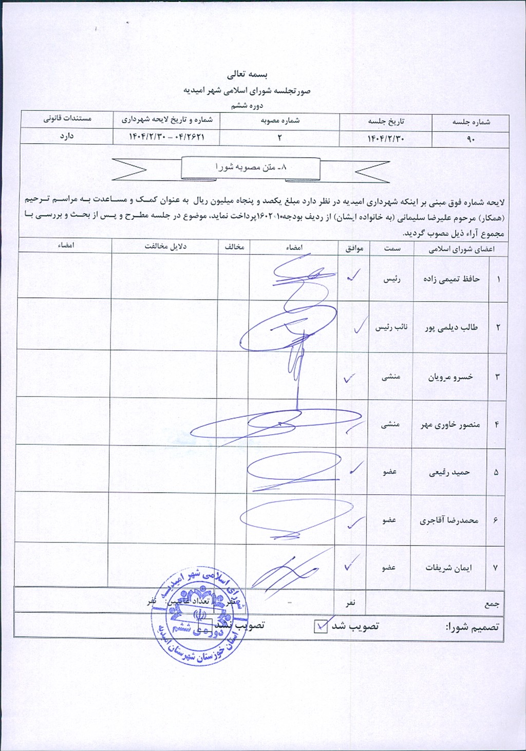 مصوبه شماره ۲ جلسه شماره ۹۰ شورای اسلامی شهر امیدیه