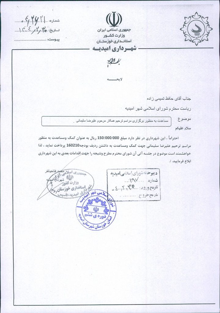 لایحه شماره فوق مبنی بر اینکه شهرداری امیدیه در نظر دارد مبلغ یکصد و پنجاه میلیون ريال به عنوان کمک و مساعدت به مراسم ترحیم (همکار) مرحوم علیرضا سلیمانی (به خانواده ایشان) از ردیف بودجه ۱۶۰۲۱۰پرداخت نماید، موضوع در جلسه مطرح و پس از بحث و بررسی با مجموع آراء ذیل مصوب گردید.