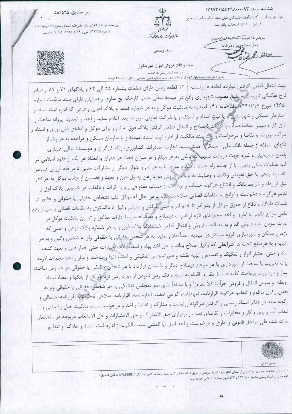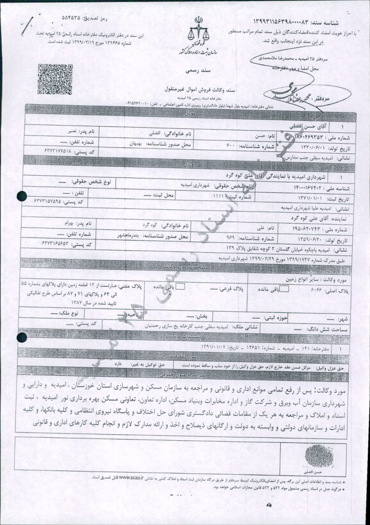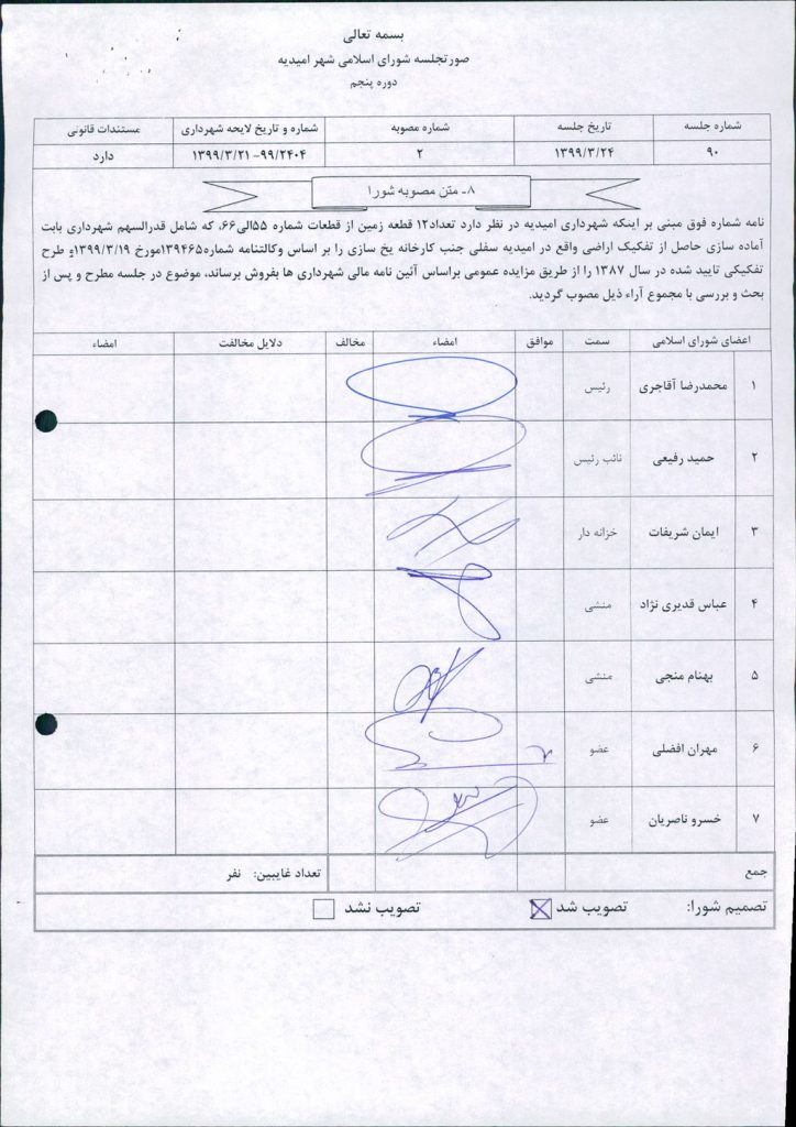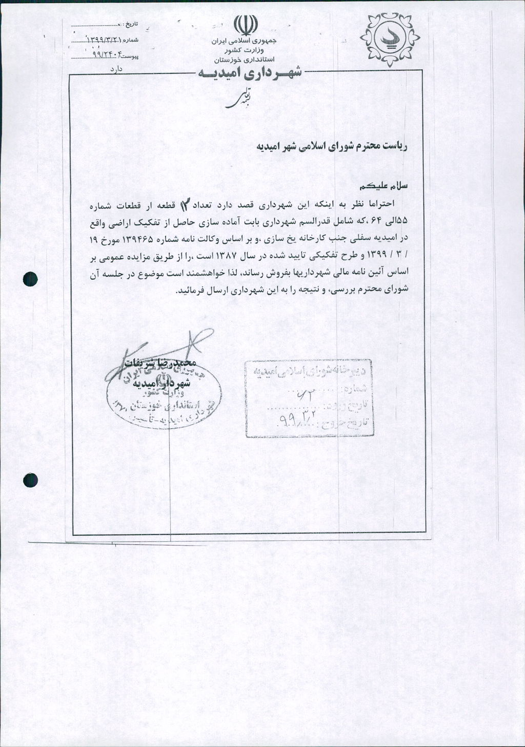 نامه شماره فوق مبنی بر اینکه شهرداری امیدیه در نظر دارد تعداد۱۲ قطعه زمین از قطعات شماره ۵۵الی۶۶، که شامل قدرالسهم شهرداری بابت آماده سازی حاصل از تفکیک اراضی واقع در امیدیه سفلی جنب کارخانه یخ سازی را بر اساس وکالتنامه شماره ۱۳۹۴۶۵ مورخ ۱۹/ ۳/ ۱۳۹۹و طرح تفکیکی تایید شده در سال ۱۳۸۷ را از طریق مزایده عمومی براساس آئین نامه مالی شهرداری ها بفروش برساند، موضوع در جلسه مطرح و پس از بحث و بررسی با مجموع آراء ذیل مصوب گردید.