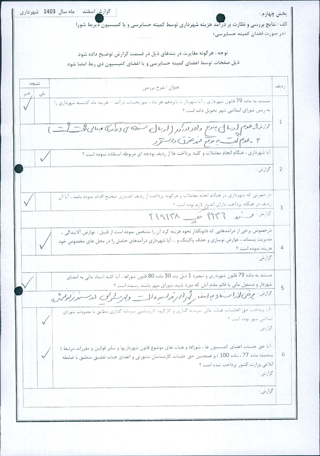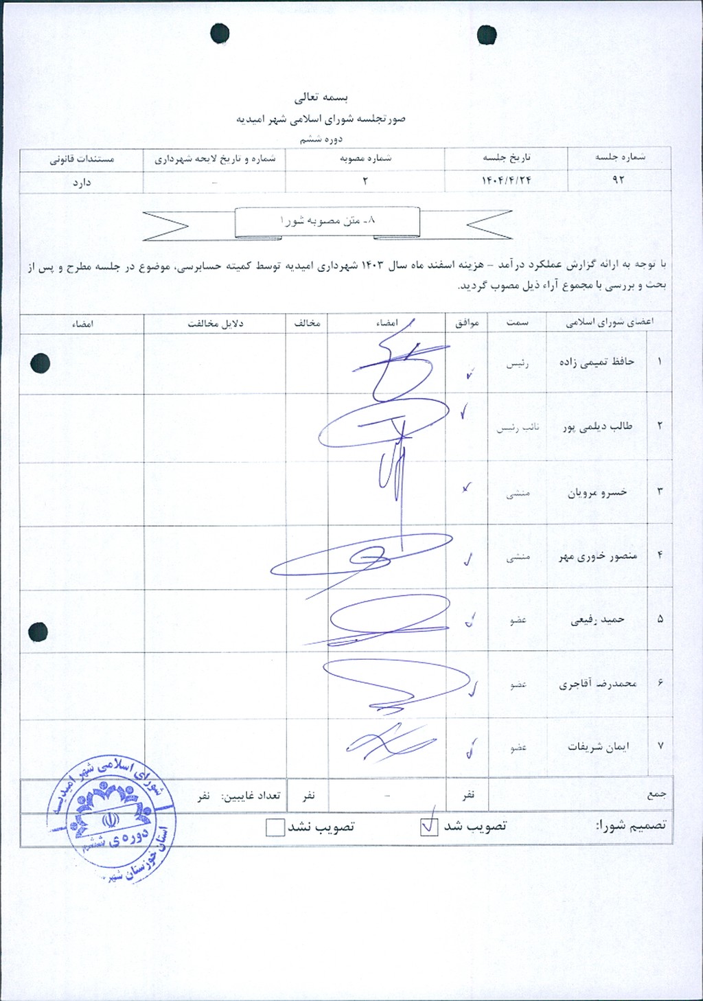 با توجه به ارائه گزارش عملکرد درآمد – هزینه اسفند ماه سال ۱۴۰۳ شهرداری امیدیه توسط کمیته حسابرسی، موضوع در جلسه مطرح و پس از بحث و بررسي با مجموع آراء ذيل مصوب گرديد.