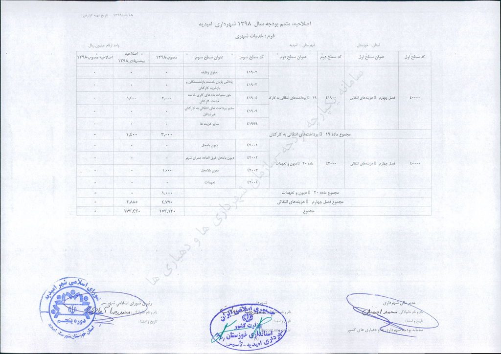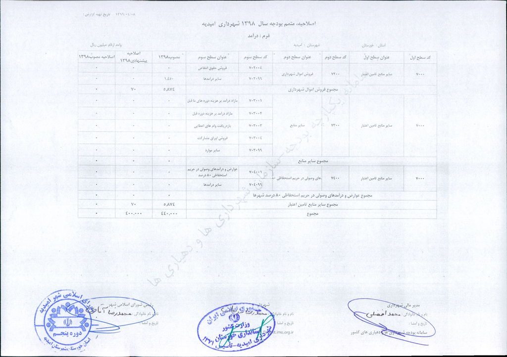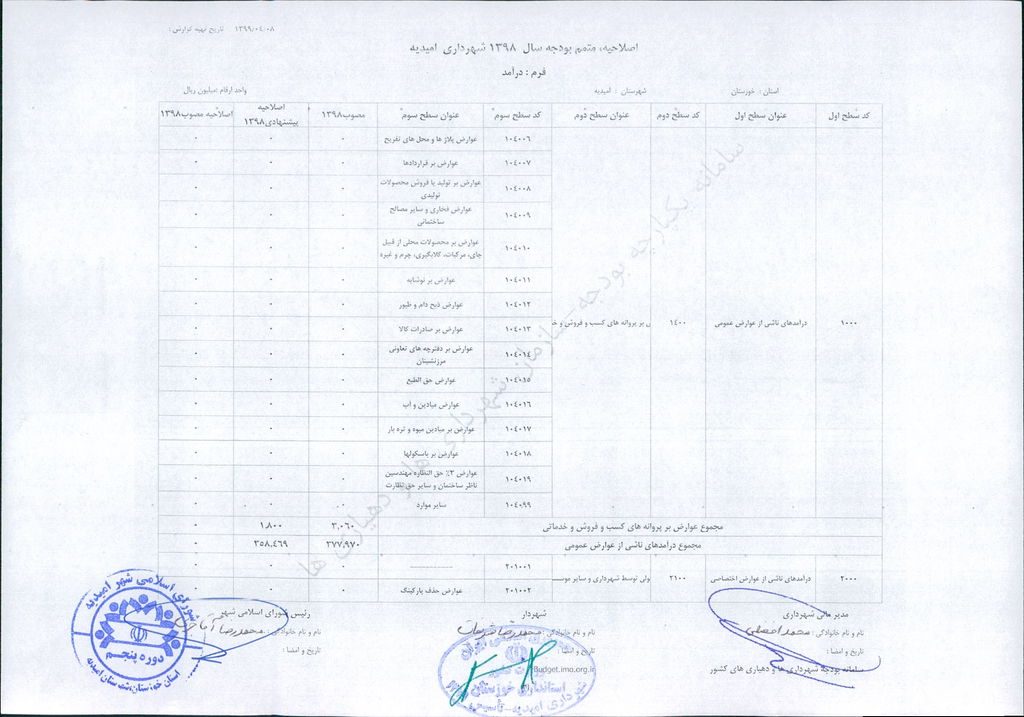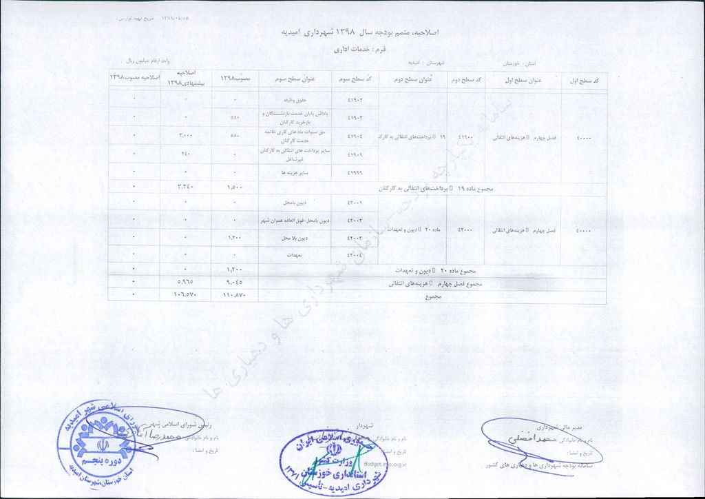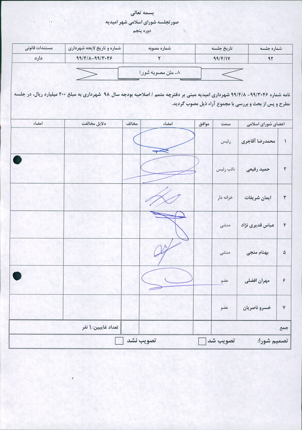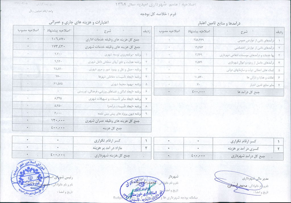 نامه شماره ۳۰۴۶/ ۹۹- ۸/ ۴/ ۹۹ شهرداری امیدیه مبنی بر دفترچه متمم /اصلاحیه بودجه سال ۹۸ شهرداری به مبلغ ۴۰۰ میلیارد ریال، در جلسه مطرح و پس از بحث و بررسی با مجموع آراء ذیل مصوب گردید.