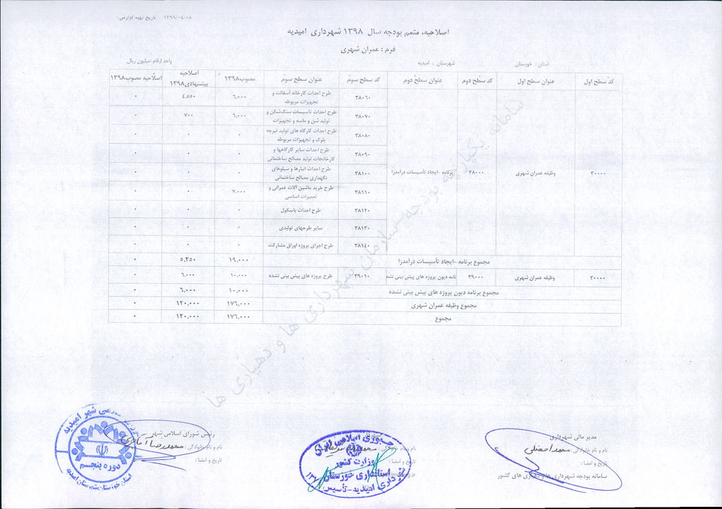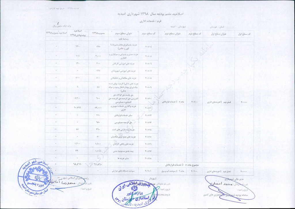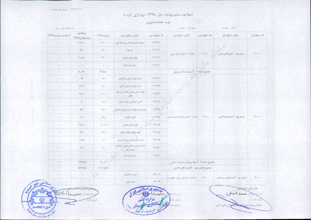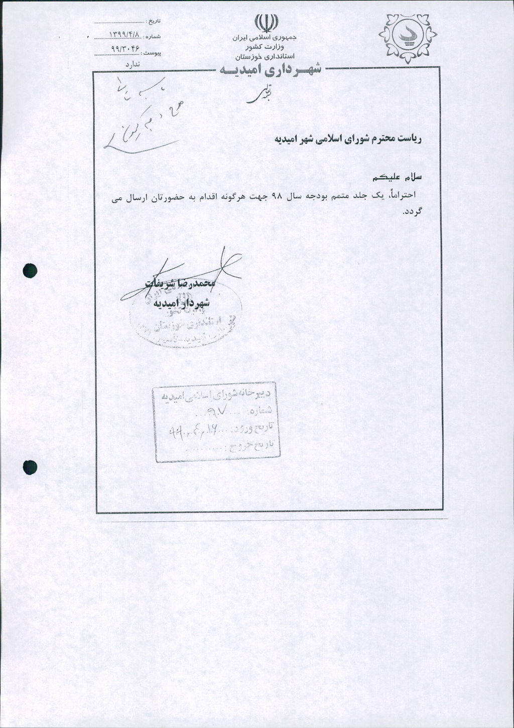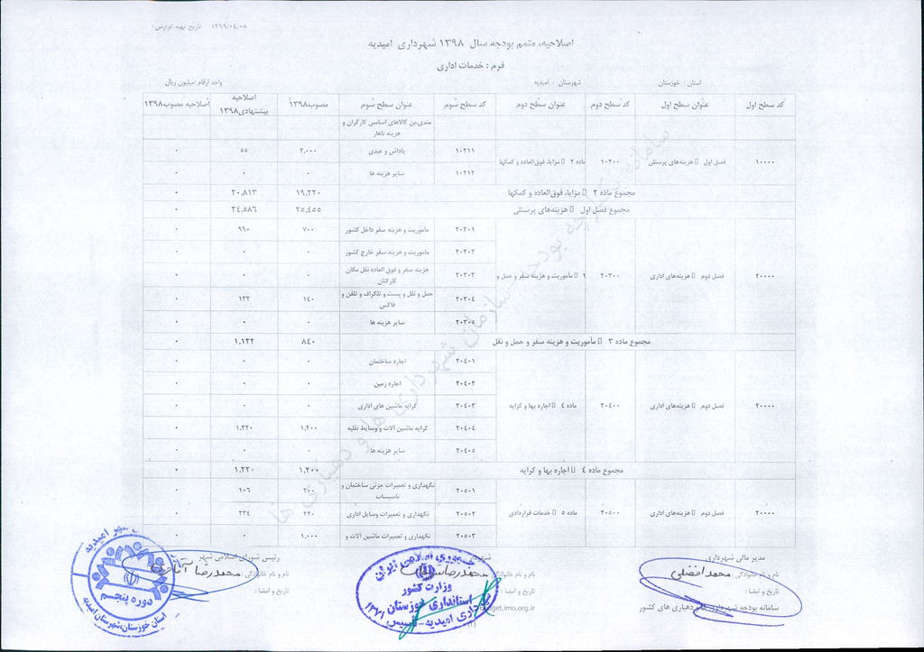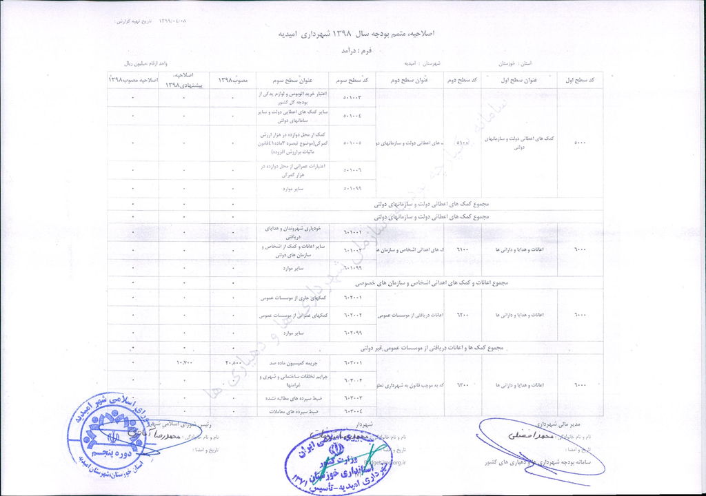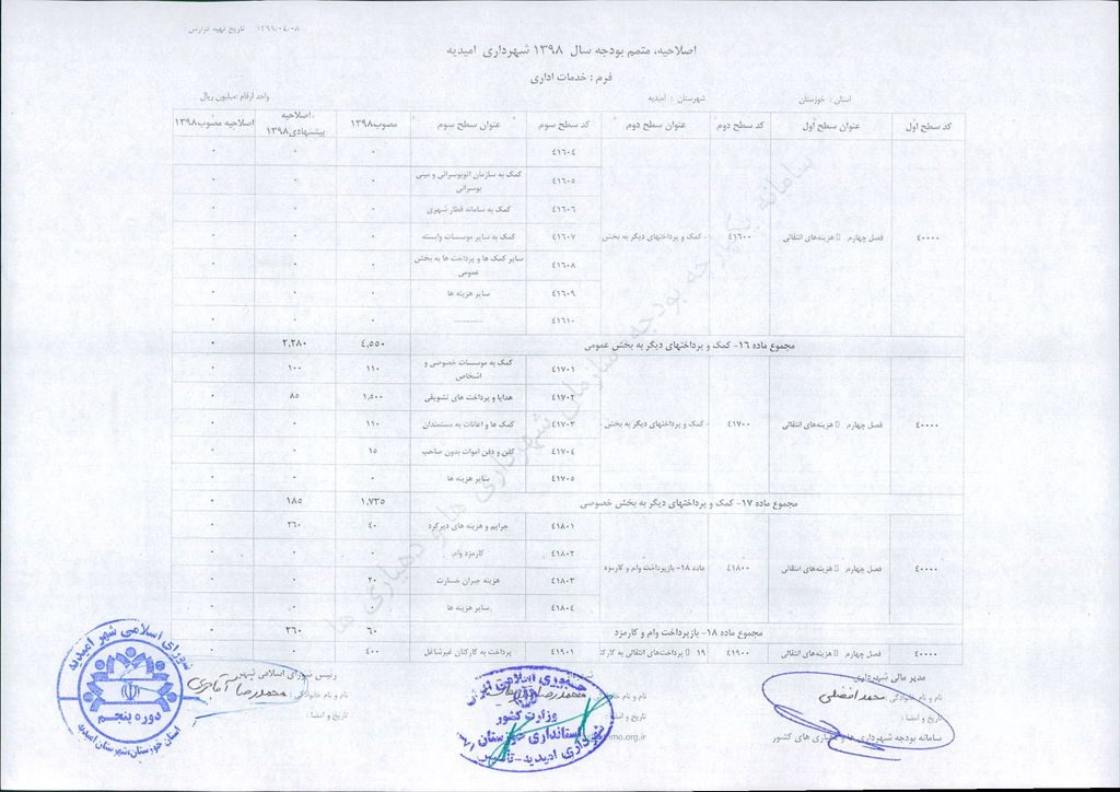 نامه شماره ۳۰۴۶/ ۹۹- ۸/ ۴/ ۹۹ شهرداری امیدیه مبنی بر دفترچه متمم /اصلاحیه بودجه سال ۹۸ شهرداری به مبلغ ۴۰۰ میلیارد ریال، در جلسه مطرح و پس از بحث و بررسی با مجموع آراء ذیل مصوب گردید.