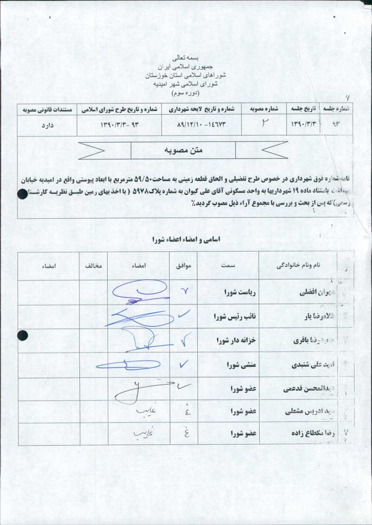مصوبه شماره ۲ جلسه شماره ۹۳ شورای اسلامی شهر امیدیه