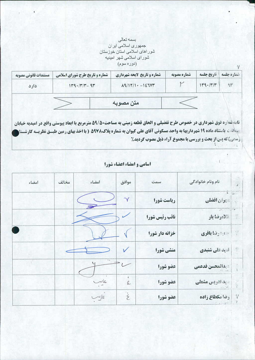 مصوبه شماره ۲ جلسه شماره ۹۳ مورخ ۹۰/۳/۳ شورای اسلامی شهر امیدیه