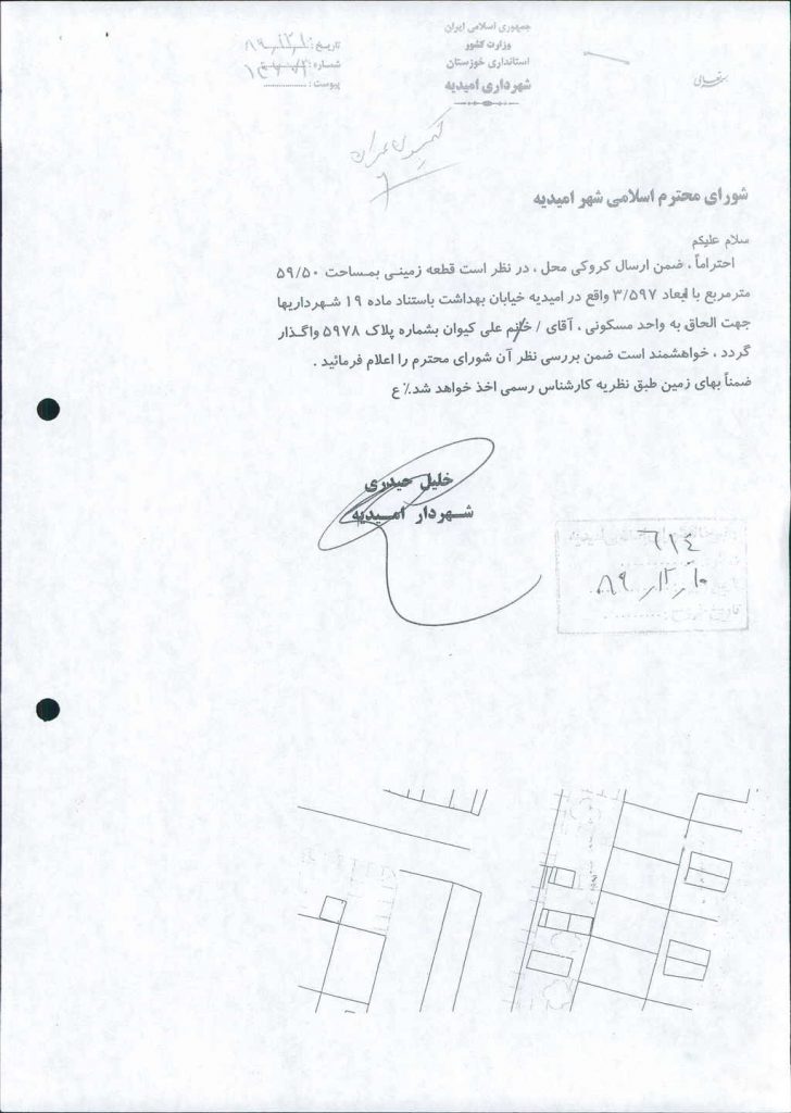 نامه شماره فوق شهرداری در خصوص طرح تفضیلی و الحاق قطعه زمینی به مساحت۵۰/ ۵۹ مترمربع با ابعاد پیوستی واقع در امیدیه خیابان بهداشت  باستناد ماده ۱۹ شهرداریها به واحد مسکونی آقای علی کیوان به شماره پلاک۵۹۷۸  ( با اخذ بهای زمین طبق نظریه کارشناس رسمی)که پس از بحث و بررسی با مجموع آراء ذیل مصوب گردید%