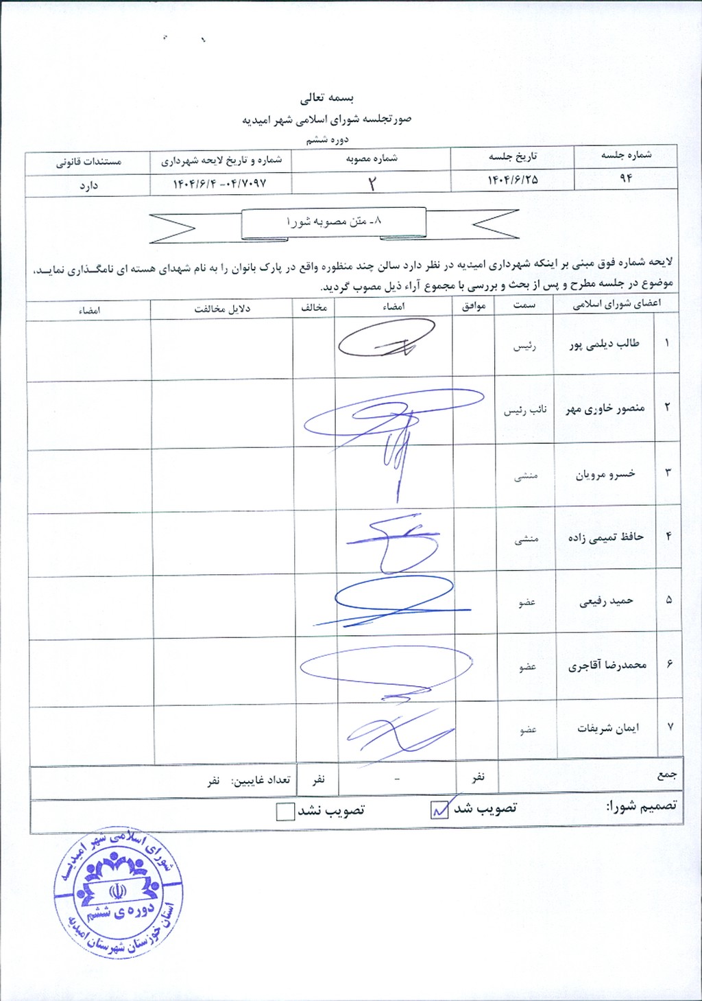 مصوبه شماره ۲ جلسه شماره ۹۴ شورای اسلامی شهر امیدیه