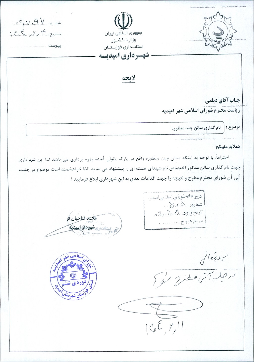 لایحه شماره فوق مبنی بر اینکه شهرداری امیدیه در نظر دارد سالن چند منظوره واقع در پارک بانوان را به نام شهدای هسته ای نامگذاری نماید، موضوع در جلسه مطرح و پس از بحث و بررسی با مجموع آراء ذيل مصوب گرديد.