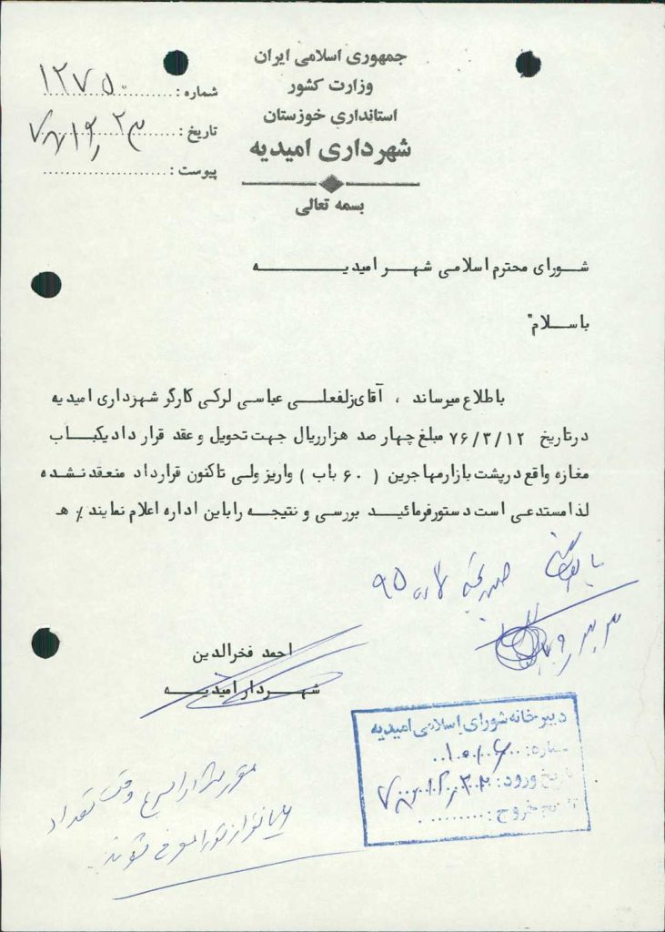 ۲-نامه شماره ۱۲۷۵۰مورخ ۲۳/ ۱۲/ ۷۸شهرداري در مورد آقاي زلفعلي عباسي لـركي مبني بر واگذاري يك باب مغازه پشت بازار مهاجرين با تعداد ۶ رأي موافقت گرديد كه با مشاراليه از سوي شهرداري برابر مصوبات قرارداد منعقد گردد.