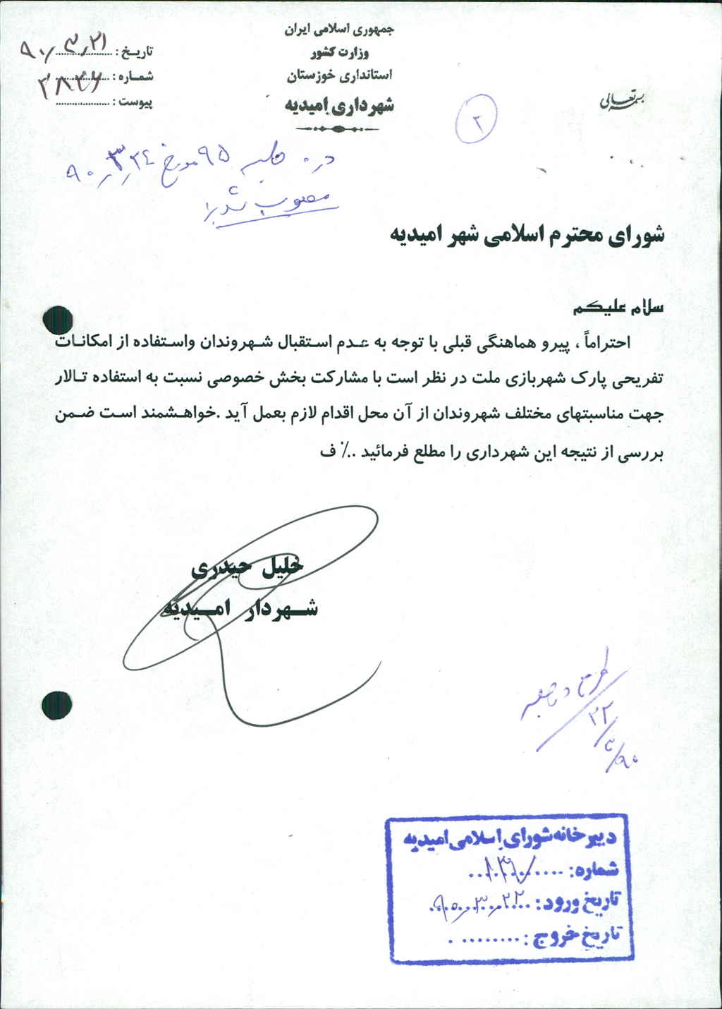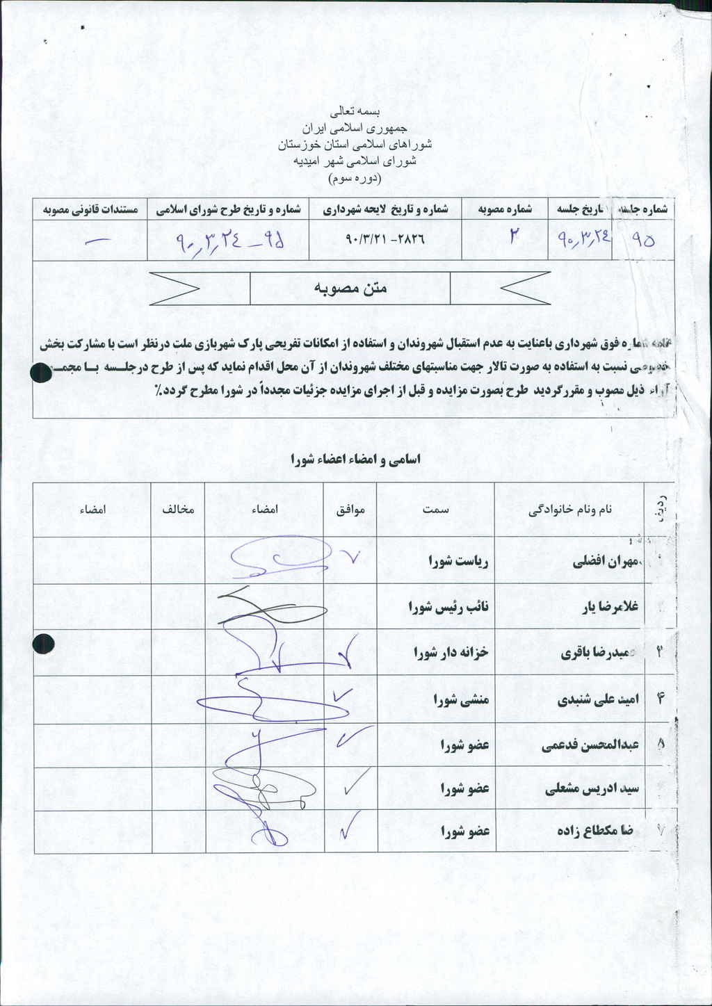 مصوبه شماره ۲ جلسه شماره ۹۵ شورای اسلامی شهر امیدیه