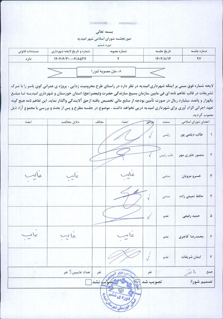 مصوبه شماره ۲ جلسه شماره ۹۷ شورای اسلامی شهر امیدیه