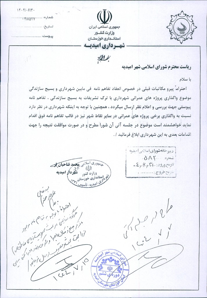 لایحه شماره فوق مبنی بر اینکه شهرداری امیدیه در نظر دارد در راستای طرح محرومیت زدایی ، پروژه ی عمرانی کوی یاسر را با ترک تشریفات در قالب تفاهم نامه ای فی مابین سازمان بسیج سازندگی حضرت ولیعصر(عج) استان خوزستان و شهرداری امیدیه تا مبلغ یکهزار و پانصد میلیارد ریال در صورت تأمین بودجه از منابع مالی تخصیص یافته ازحق آلایندگی واگذار نماید. این تفاهم نامه هیچ گونه تعهد اجرائی الزام آوری برای شهرداری امیدیه درپی نخواهد داشت ، موضوع در جلسه مطرح و پس از بحث و بررسی با مجموع آراء ذيل مصوب گرديد.