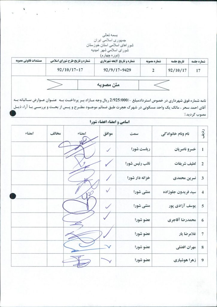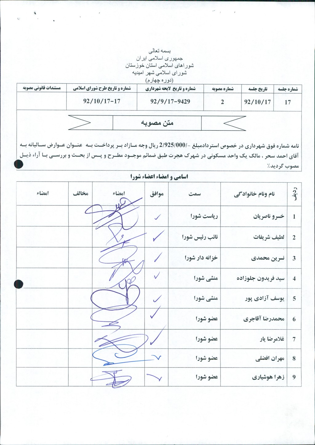 مصوبه شماره ۲ جلسه شماره ۱۷ شورای اسلامی شهر امیدیه