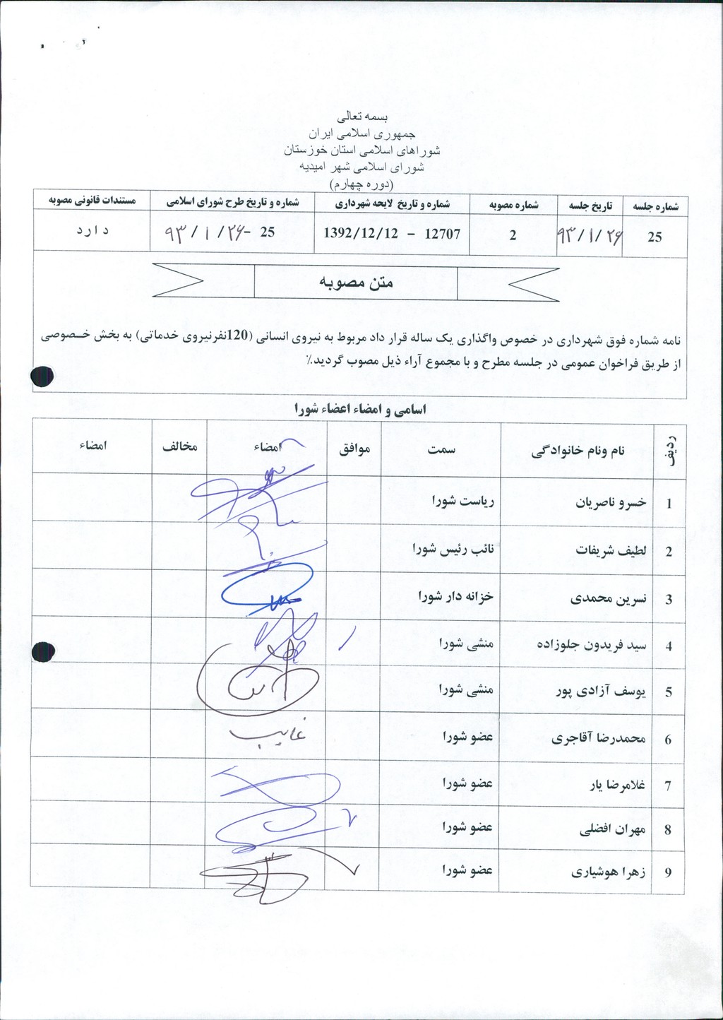 مصوبه شماره ۲ جلسه شماره ۲۵ شورای اسلامی شهر امیدیه