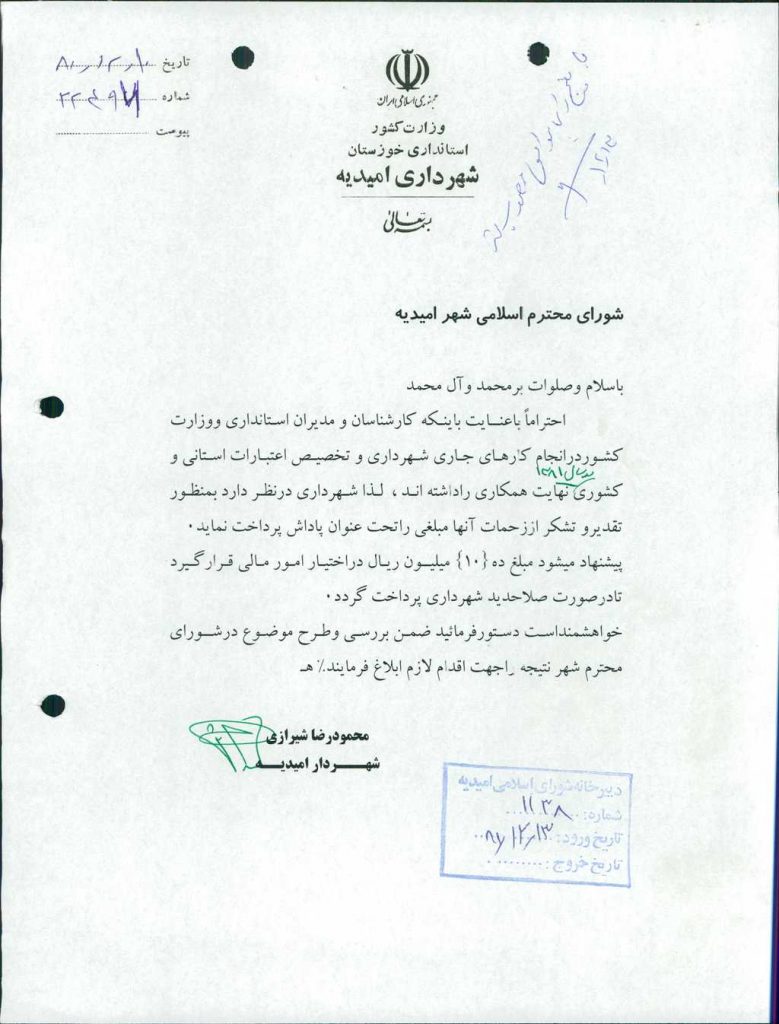 مصوبه شماره ۲۱ جلسه شماره ۳۱۶ مورخ ۸۱/۱۲/۱۳ شورای اسلامی شهر امیدیه