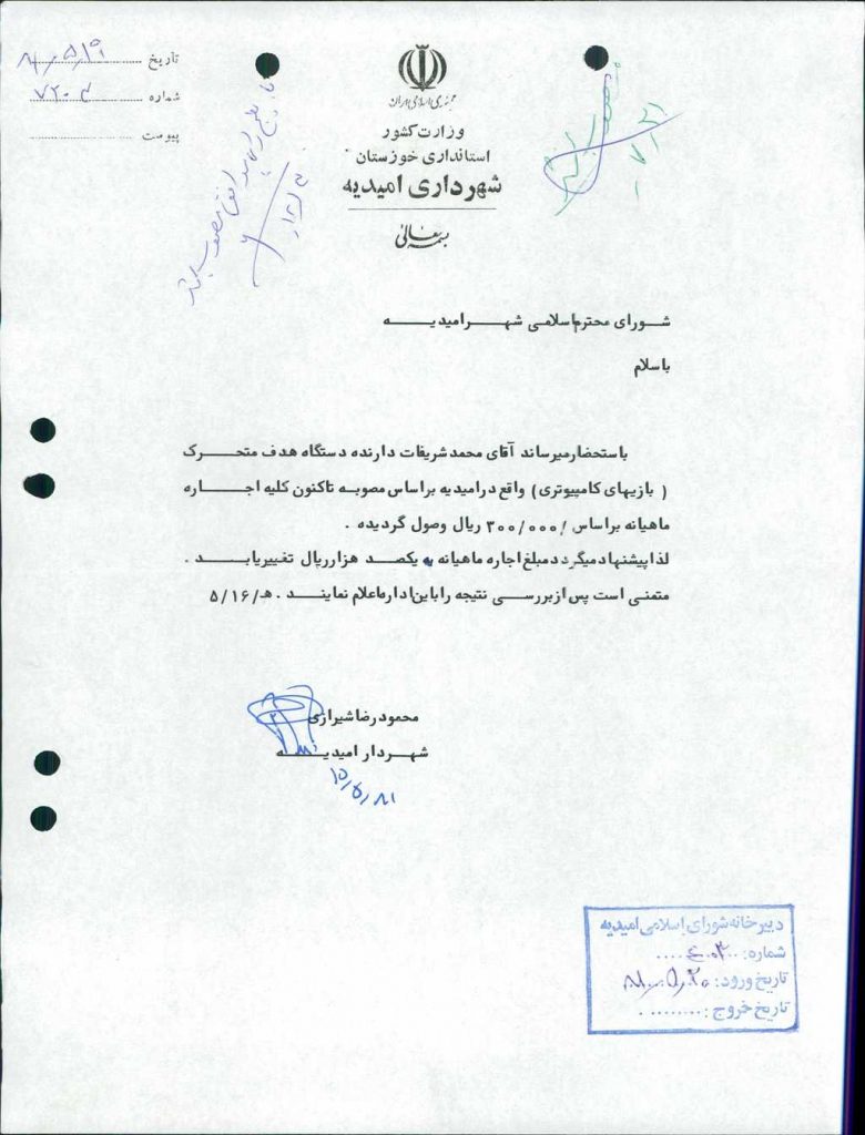 ۲۲-نامه شماره ۷۲۰۳-۱۹/ ۵/ ۸۱شهرداري برپرداخت اجاره ماهيانه يكصدهزار ريال از سوي آقاي محمدشريفات بابت دستگاه هدف متحرك (بازيهـاي كامپيوتري) واقع در اميديه مطرح و با ۵رأي موافق به تصويب رسيد.