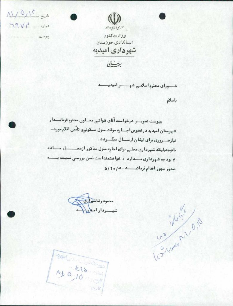 ۲۶-نامـه شماره ۶۹۷۴مورخه۱۴/ ۵/ ۸۱شهرداري در خصـوص آقاي عبدالرسول قنواتي معاون محترم فرماندار شهرستان  اميديه مبني بـر درخواست اجاره يك باب منزل و به امانت گرفتن يكدستگاه كولرگازي پس از بحث وبرسي با ۵ رأي موافق به تصويب رسيد.